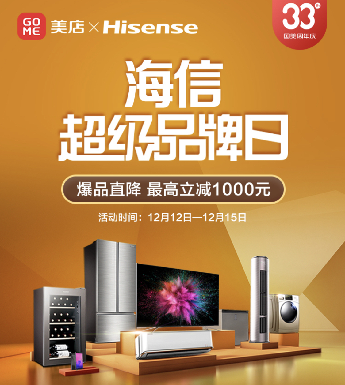 深圳新聞網(wǎng)2019年12月12日訊 12月12日-15日,國(guó)美33周年慶活動(dòng)已經(jīng)啟動(dòng),屆時(shí)消費(fèi)者可在深圳國(guó)美門店參與“全場(chǎng)好物,第二件5折起”活動(dòng)。同時(shí),海信、海爾、美的超級(jí)品牌日活動(dòng)也將于12日-15日期間在國(guó)美美店展開。用戶在國(guó)美APP中美店活動(dòng)專區(qū)便可參與到活動(dòng)中來,下面為大家介紹下本次海信超級(jí)品牌日的重磅爆品,全場(chǎng)最高立減1000元,還有機(jī)會(huì)獲得愛奇藝四端VIP會(huì)員卡和小度音箱等福利獎(jiǎng)品,不要錯(cuò)過。
