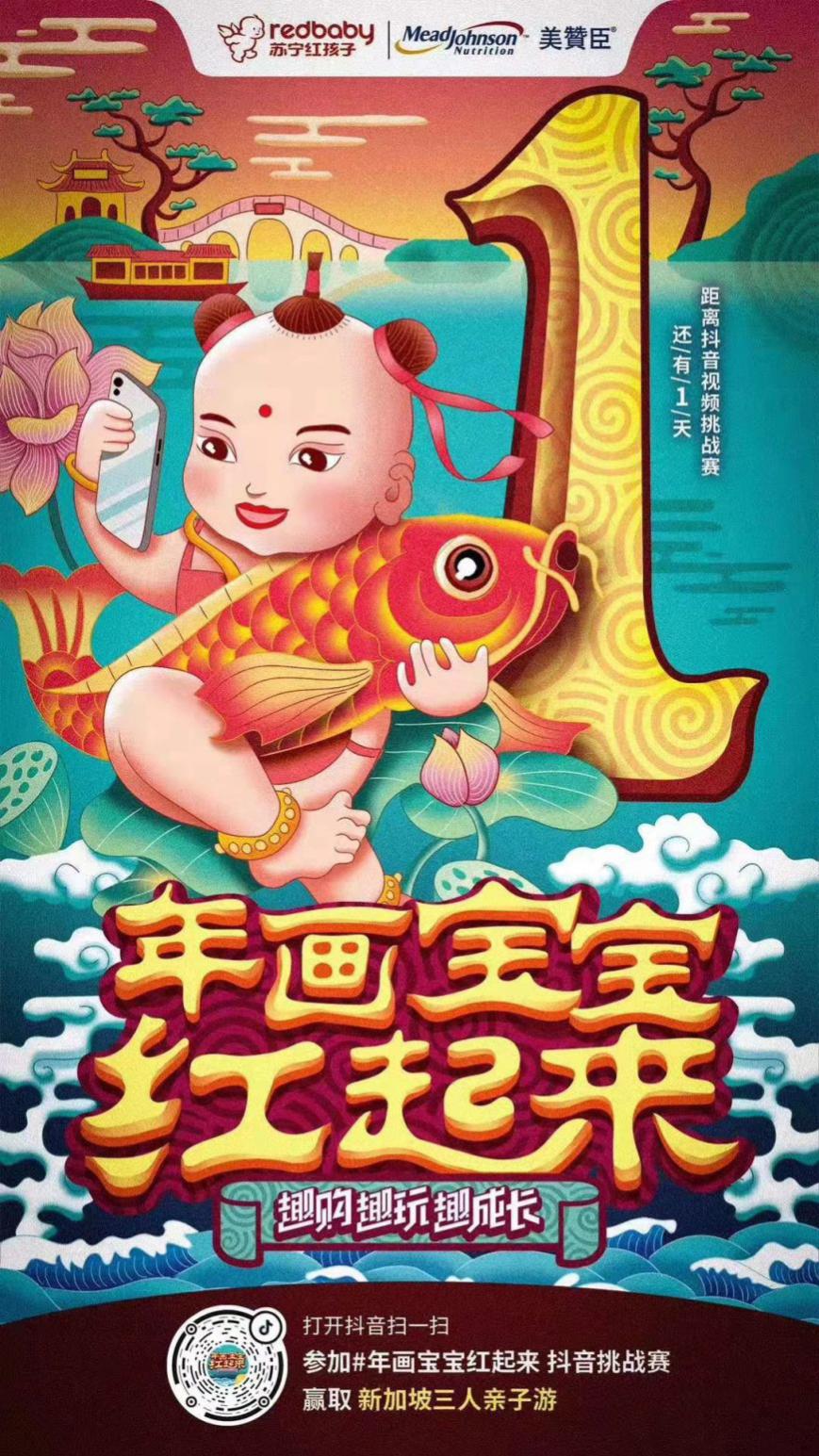 上周,蘇寧紅孩子官方發(fā)起了一場“年畫寶寶紅起來”的抖音挑戰(zhàn)賽活動。12月10日-12月31日,在抖音搜索話題,使用蘇寧紅孩子專屬貼紙,讓萌娃變身年畫寶寶,發(fā)布曬娃視頻,就能參與。參與活動就有機會贏取全家新加坡親子游大獎,寶萌照更有機會登上戶外大屏,紅動全城。