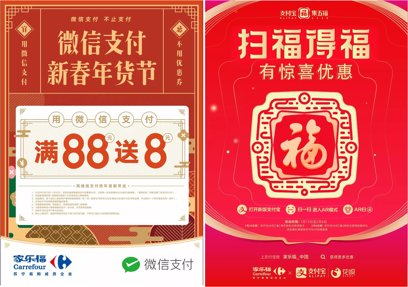 除此之外,各大支付平臺優(yōu)惠券亦開始發(fā)放,助力您的年貨采買。前方高能預警!1月13日至2月8日,顧客使用支付寶掃上圖“?!弊忠约皡⑴c集五福活動,即有機會獲得家樂福全場滿200減10優(yōu)惠券。1月13日至1月30日,在家樂福使用微信支付消費滿80元,可獲得一張全場滿88元立減8元優(yōu)惠券,