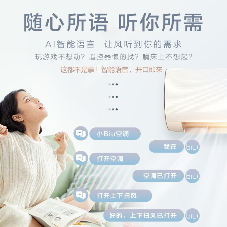 此外,小Biu空調(diào)Max搭載了AI智能語音控制技術(shù),你只需要對它說“小Biu空調(diào)”將其喚醒,就能實現(xiàn)開機關(guān)機、模式切換、調(diào)節(jié)溫度等操作,實現(xiàn)了真正的智能語音操控。同時,小Biu空調(diào)Max采用行業(yè)一流的海立壓縮機,并具有高溫自清潔、APP遠程控制、急速冷暖等亮點功能,提供整機6年、壓縮機10年保修的服務。