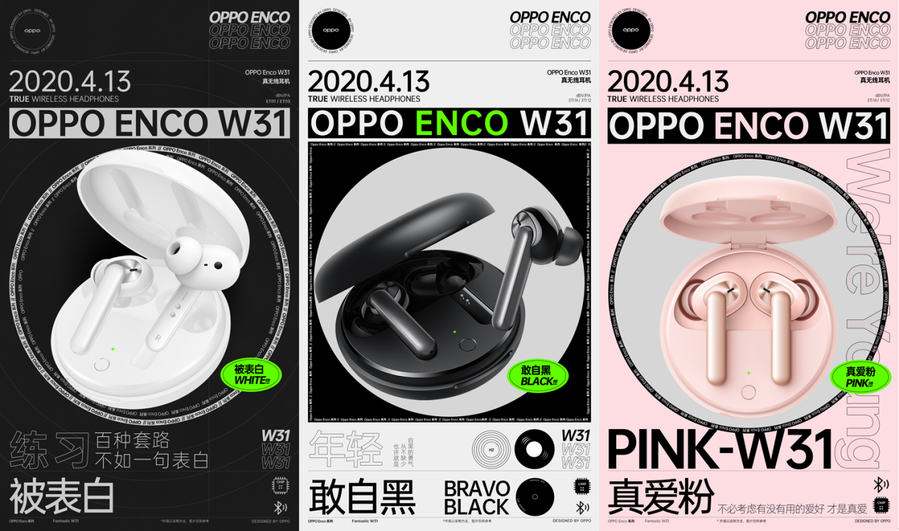 OPPO Enco W31真無線耳機將極簡設計美學與前沿科技完美糅合,化身潮流好物。遵循簡約小巧的設計理念,外殼圓潤輕巧,方便用戶隨身攜帶。擁有敢自黑、被表白、真愛粉三種配色可供選擇,滿足年輕人不同個性的表達。