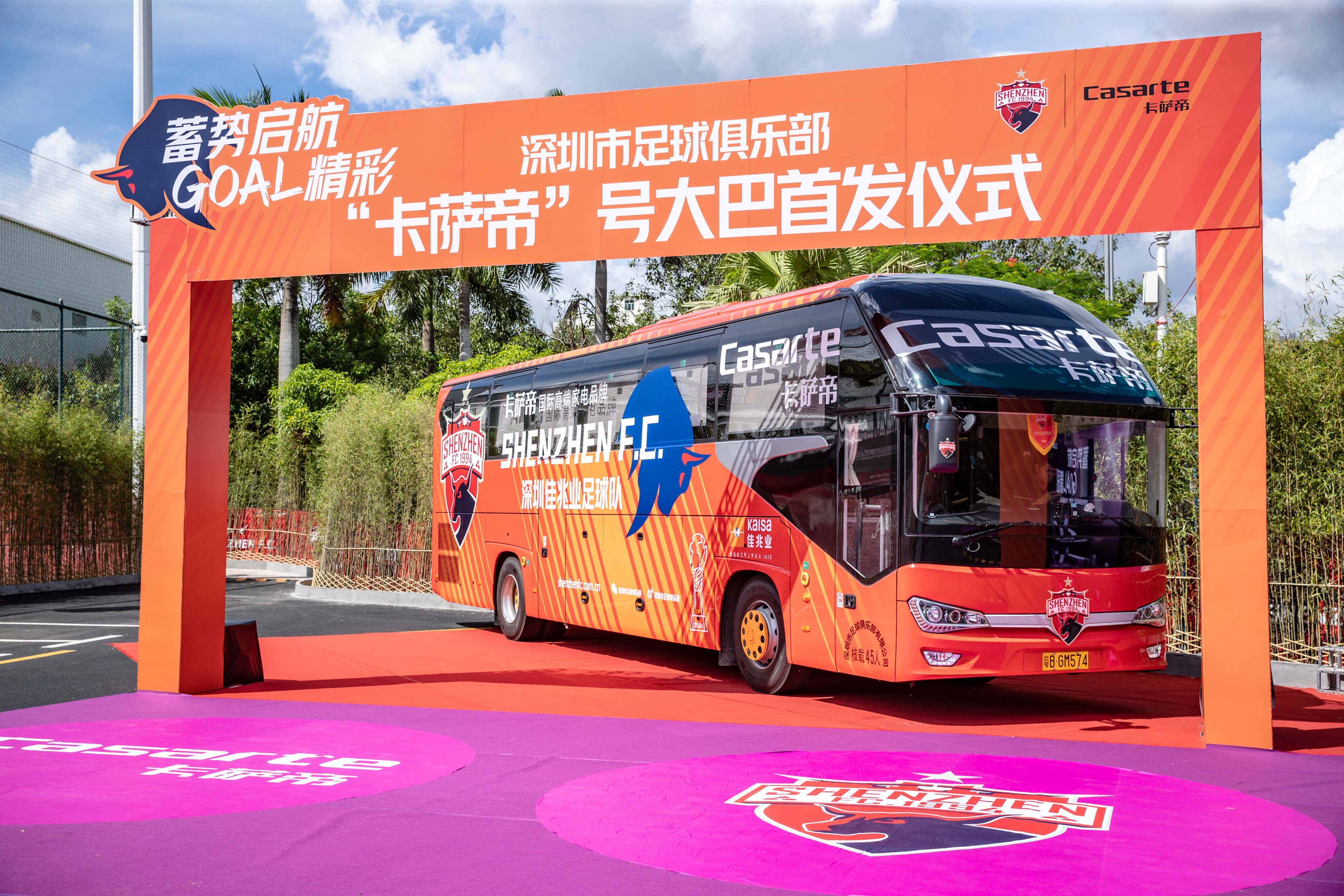在交車儀式上,新大巴自然是當(dāng)之無愧的主角。深圳佳兆業(yè)隊(duì)此次全新投入使用的大巴,外觀設(shè)計(jì)結(jié)合了深足+卡薩帝(Casarte)元素。大巴以橙色為底色,印有Casarte卡薩帝和深圳佳兆業(yè)足球隊(duì)的字樣,并在車身顯眼處印有深足LOGO。整車采用空氣動(dòng)力學(xué)造型,現(xiàn)代感和運(yùn)動(dòng)感十足,是全新一代的高端公路客車產(chǎn)品。