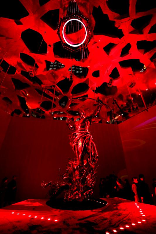 大型沉浸式藝術(shù)裝置“赤子心”橫跨了平安金融中心商場九至十層平臺,總占地面積近四千平方米。在展出十五件大型雕塑作品的同時,將光影藝術(shù)與聲音藝術(shù)巧妙融合,串聯(lián)起虛擬影像與現(xiàn)實空間,以闡釋純粹、無畏的赤子之心?!俺嘧有摹笔褂^眾走入藝術(shù)品內(nèi)部、探索藝術(shù)家的內(nèi)心深處,通過親身參與展覽并與之對話,從而理解“其大無外,其小無內(nèi),世界即內(nèi)心投射”的本質(zhì)。