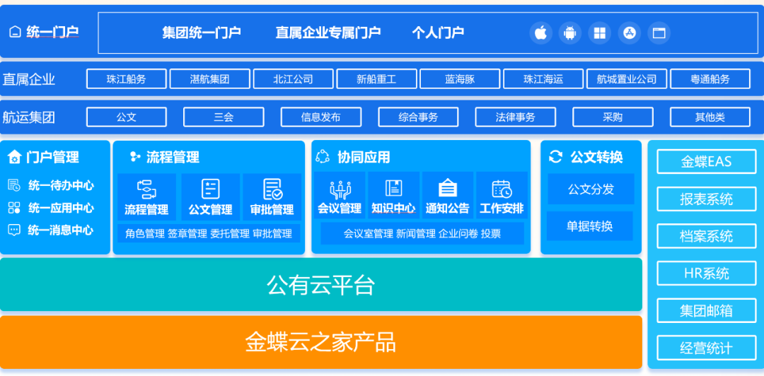 作為大型綜合性國企,廣東航運集團(tuán)現(xiàn)有直屬企業(yè)8家,擁有全資、控股、參股及代理水路客運港口13家,經(jīng)營和管理96艘粵港澳高速客船。伴隨經(jīng)營規(guī)模的發(fā)展、技術(shù)迭代、應(yīng)用場景深入,其信息化需要一個可以覆蓋集團(tuán)協(xié)同應(yīng)用場景的綜合辦公平臺,而集團(tuán)原有的OA已經(jīng)無法滿足航運的持續(xù)發(fā)展需要。