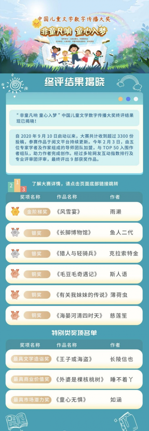 深圳新聞網(wǎng)2021年6月1日訊“非童凡響童心入夢”中國兒童文學數(shù)字傳播大獎6月1日揭曉終評結果,《風雪宴》等9部參賽作品從3300余部作品中脫穎而出。大獎終評頁面已在人民日報數(shù)字傳播有限公司旗下“人民閱讀”平臺、中國中福會出版社、閱文集團等平臺全面上線。