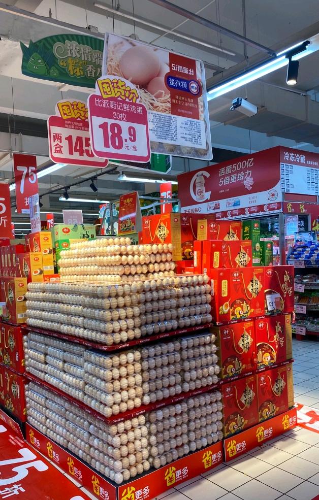 記者在走訪家樂(lè)福發(fā)現(xiàn),各大品牌的咸鴨蛋禮盒、粽子禮盒都已經(jīng)陸續(xù)上市。在咸鴨蛋禮盒中,神丹20枚皮蛋贅婿聯(lián)名款和神丹18枚青殼咸鴨蛋兩款禮盒都備受歡迎。