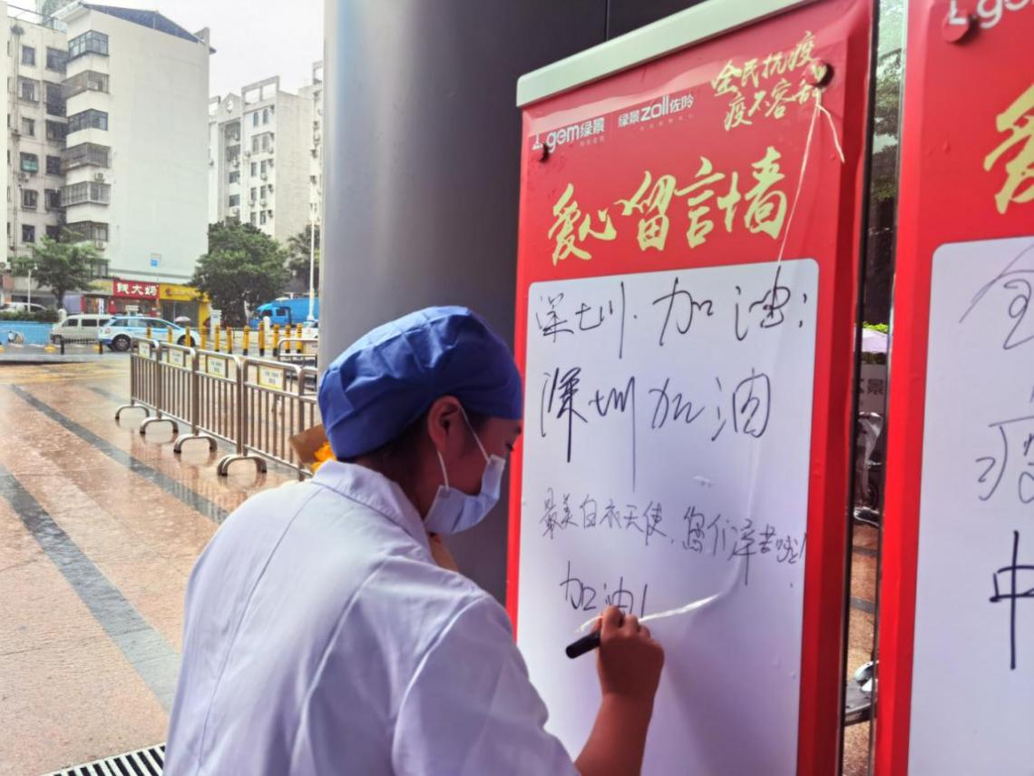 下梅林社區(qū)健康服務(wù)中心的護士小姐姐們,也在中午換崗的間隙,來到了活動現(xiàn)場挑選美食。護士小姐姐們非常高興地表示,在暴雨天不用等外賣,就可以享受暖心的美味午餐,可以留出更多的時間,回到崗位工作,繼續(xù)“戰(zhàn)疫”!其中還有一位可愛的護士小姐姐為給自己加油打氣,在愛心留言墻上,寫下了“加油!我們是最棒的!”