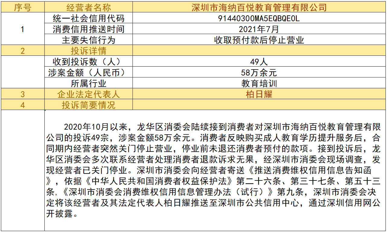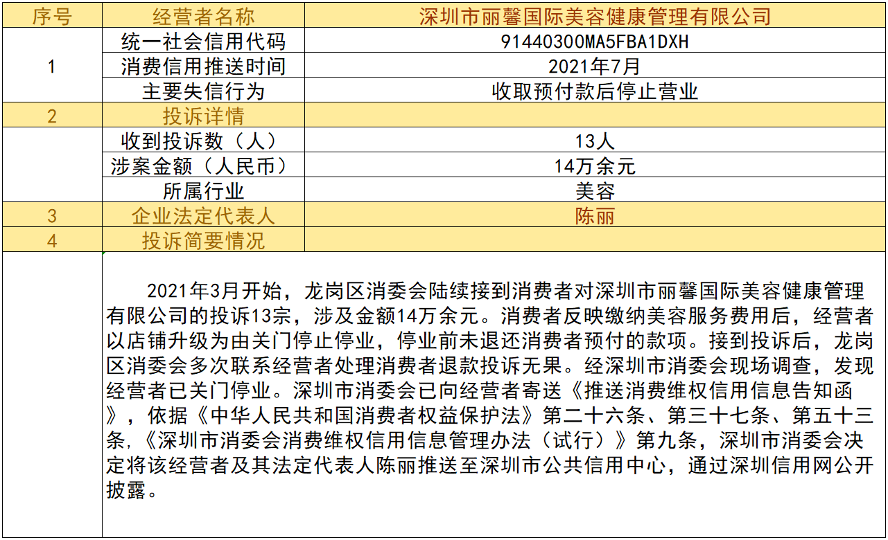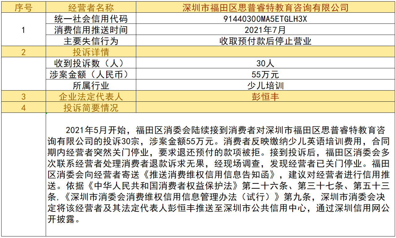 近日,深圳市消委會(huì)將九家“跑路”、未按約定退還消費(fèi)者預(yù)付款項(xiàng)的經(jīng)營(yíng)者及其主要負(fù)責(zé)人推送至深圳市公共信用中心,失信經(jīng)營(yíng)者信息信息將通過深圳信用網(wǎng)公開披露。