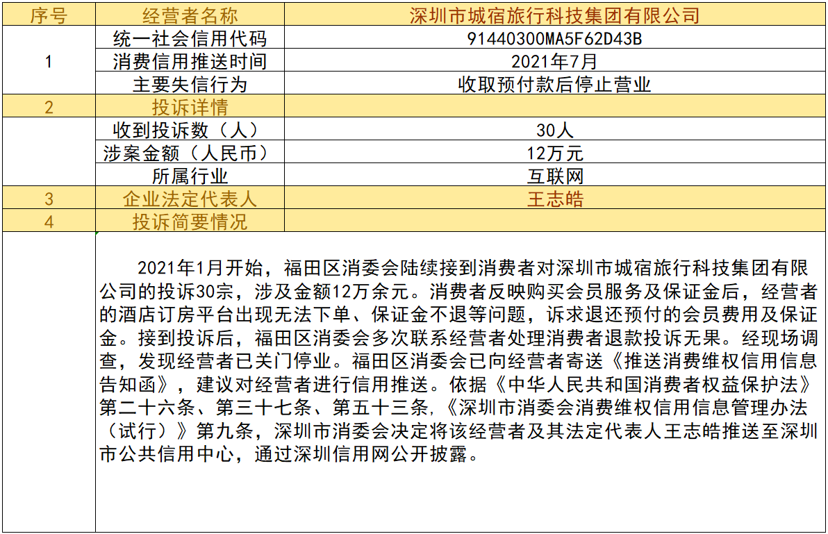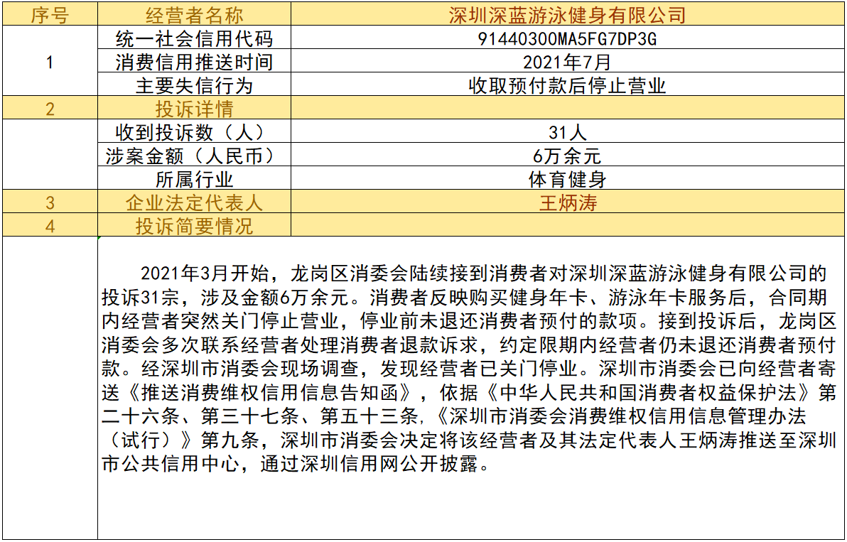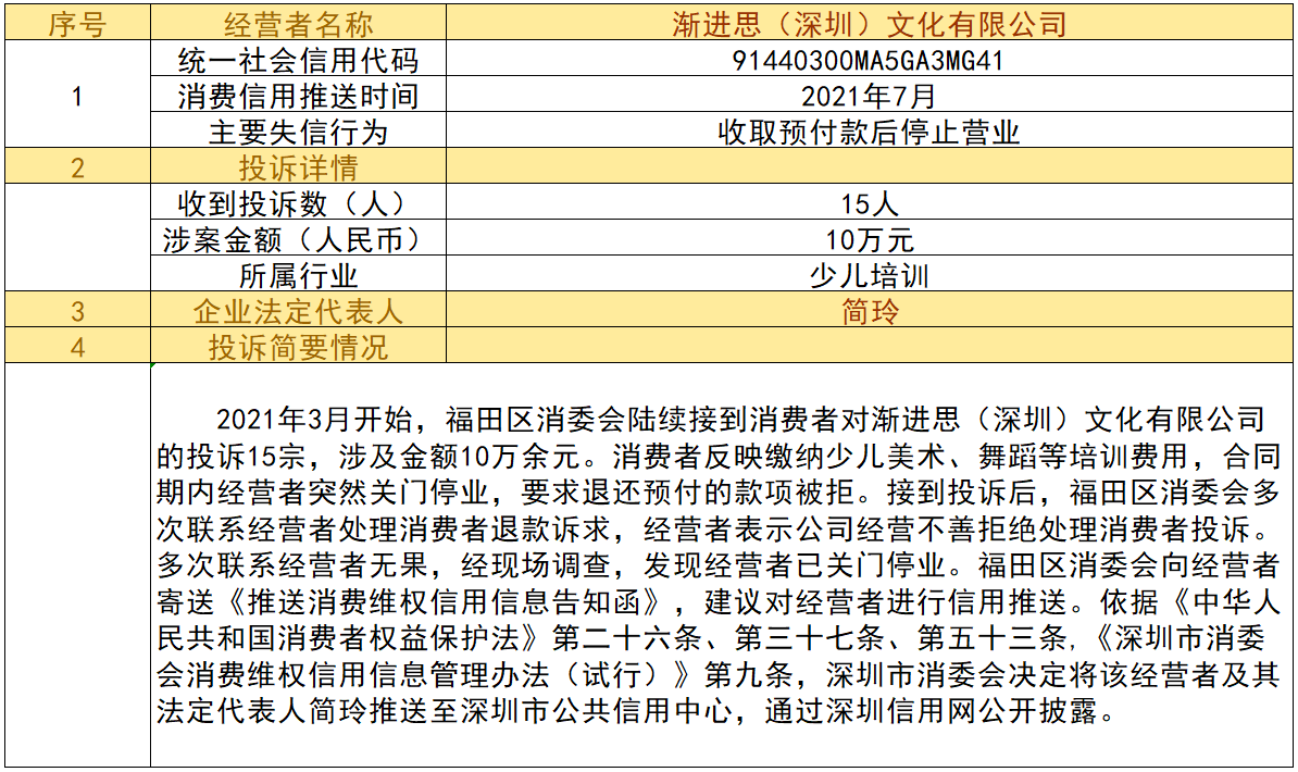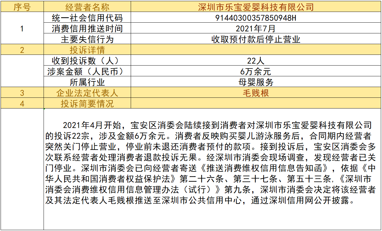 近日,深圳市消委會(huì)將九家“跑路”、未按約定退還消費(fèi)者預(yù)付款項(xiàng)的經(jīng)營(yíng)者及其主要負(fù)責(zé)人推送至深圳市公共信用中心,失信經(jīng)營(yíng)者信息信息將通過深圳信用網(wǎng)公開披露。