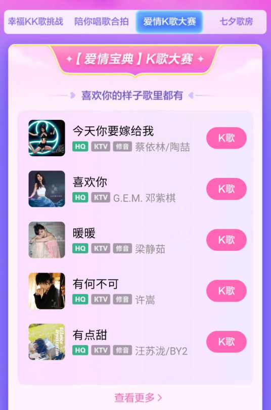 此次活動的主題曲《幸福KK歌》改編自著名歌謠《幸福拍手歌》,喜歡手勢舞蹈的朋友可以嘗試“幸福KK歌”親密挑戰(zhàn),只要按照示例視頻演唱歌曲并完成5個指定動作,發(fā)布視頻即挑戰(zhàn)成功;而對于喜歡對唱的人,可以選擇“陪你唱歌”心動合拍大賽,在合唱模板中,pick讓你心動的小哥哥/小姐姐,發(fā)布與TA的合唱即算挑戰(zhàn)成功;“情歌王”們則可以來「愛情寶典」K歌大賽一展歌喉,演唱官方七夕主題歌單中的歌曲,人氣排名前10的優(yōu)秀用戶也能獲得獎勵;還有七夕歌房任務限時開啟,完成七夕歌單演唱、“一起聽”情歌、七夕“話題熱聊”任務,即可獲得“七夕大聲愛”“加油鴨”等道具禮物。