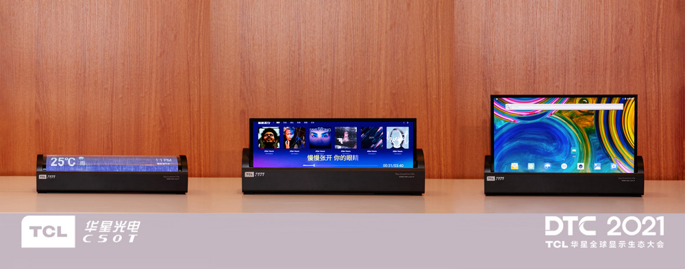 14"噴墨打印OLED卷軸屏,可以自由變換多種形態(tài),數字顯示鬧鐘、音樂播放器、顯示器,多種應用形態(tài)無縫切換,完美融入家居場景中,盡顯柔性OLED顯示的魅力。它的卷曲半徑<R20mm,在高溫高濕條件下,卷曲壽命高達10萬次,再配合自發(fā)光高精度噴墨印刷工藝制備技術,以及內置的AI補償算法,可以使它的畫面色彩更加明艷通透,顯示效果也得到了大幅提升。該產品目前由TCL華星跟日本JOLED合作推出。