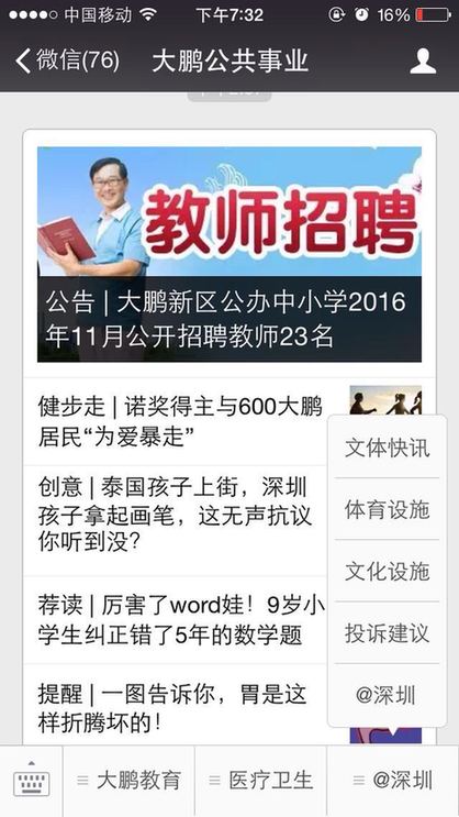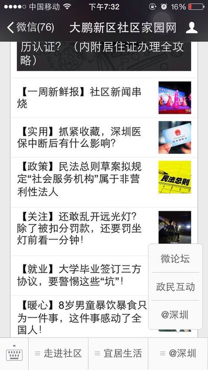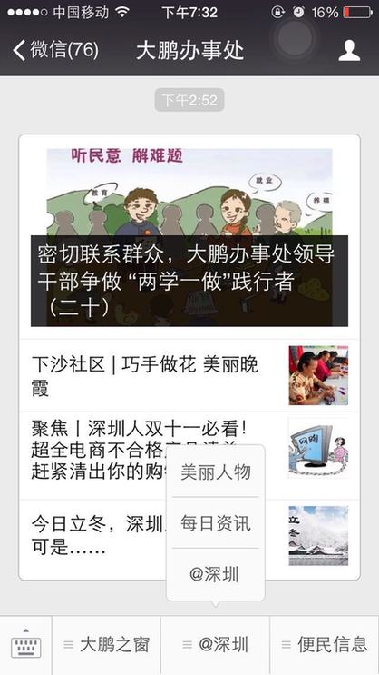 ??? 截止到11月7日,大鵬新區(qū)已有大鵬先鋒、大鵬新區(qū)社區(qū)家園網、大鵬公共事業(yè)、筑夢大鵬、、大鵬辦事處等多家政府官方微信公眾號入駐了@深圳。