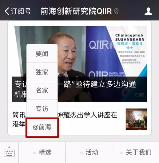 在“前海創(chuàng)新研究院QIIR”的底部菜單欄里找到“@前?!?,就可進(jìn)入以下頁面,從研究院放眼前海,獲得一手新鮮資訊。