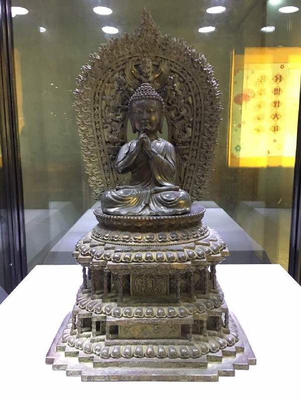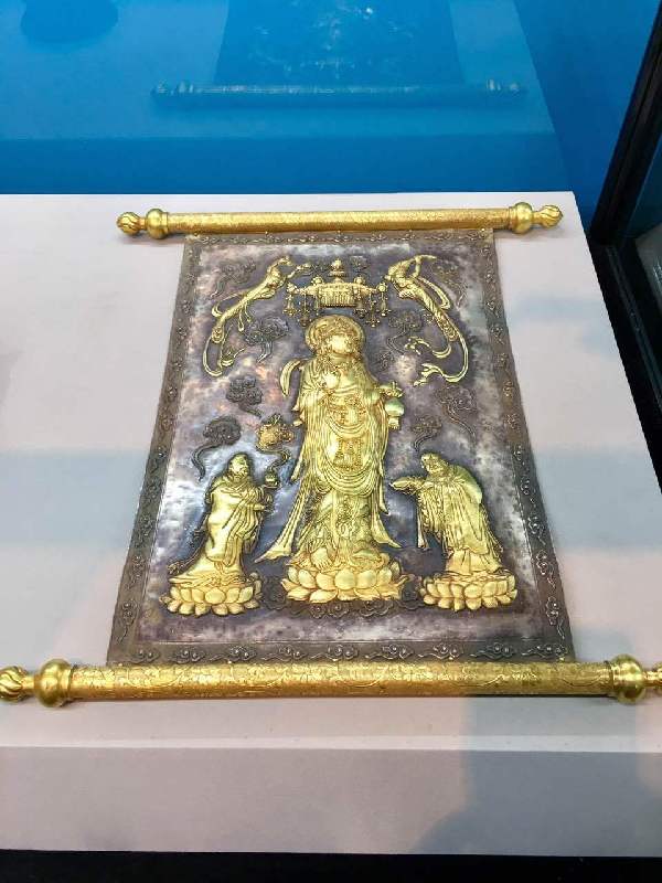 繼上個(gè)月舉辦的第一季“民國瓷畫展”,目前正在展覽的是第二季“佛像藝術(shù)展”。展出了遼金時(shí)期的銀鎏金佛塔、宋代泥塑描金的書卷觀音像、唐代捶揲銀鎏金“佛說金色王經(jīng)”上下卷,還有南北朝時(shí)期的石雕彩漆描金思維菩薩像,這一期展出了29件展品。