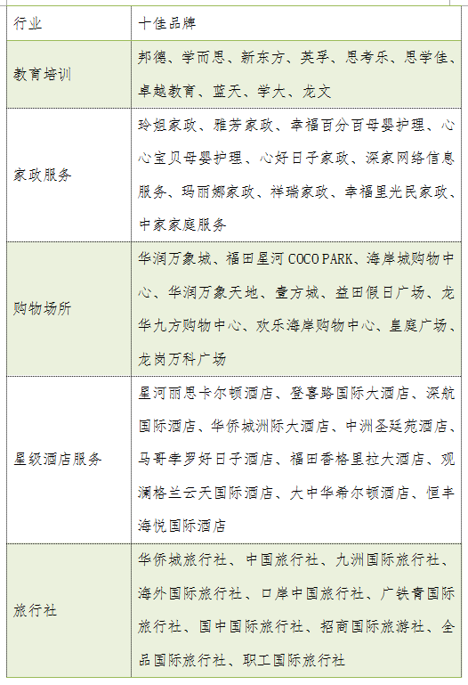 教育培訓(xùn)方面20個(gè)課外培訓(xùn)機(jī)構(gòu)品牌的凈推薦值得分均為正值,整體平均得分為13.7,邦德教育以19.9的高分榮登教育培訓(xùn)行業(yè)榜單首位;家政服務(wù)行業(yè)20家調(diào)查企業(yè)平均分值為12.8,玲姐家政以高于平均值7.4分,排名家政行業(yè)第一位;購物場(chǎng)所方面選取20家購物中心,20家購物中心得分同樣為正值,整體平均分為19.8,華潤萬象城以28.5的高分獲得購物中心排行榜桂冠,福田星河coco park以0.1分的劣勢(shì)排在榜單第二位;星級(jí)酒店服務(wù)方面,平均凈推薦值達(dá)到30.8分,高于同期發(fā)布其他四個(gè)行業(yè),排名第一的是星河麗思卡爾頓酒店,凈推薦值為37.0分;旅行社方面,排名第一的旅行社為華僑城旅行社評(píng)分29.8分,但20家旅行社之間評(píng)分差異較大,凈推薦值僅為12.0分,低于同期發(fā)布的其他行業(yè)。