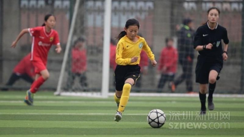 東方小學學生左婉欣代表寶安隊參加全國青少年足球比賽帶球突破