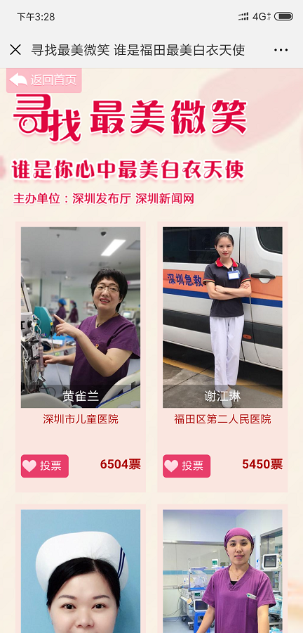 ② 多個投票活動已經形成良好群眾效應,合作方主辦方多屆舉辦,每屆舉辦均由深圳新聞網(wǎng)負責投票系統(tǒng)開發(fā),例如:健康場所投票、集團攝影大賽評選投票、政務類投票。形成了良好品牌效應和示范,往往一個區(qū)舉辦的投票活動其他區(qū)會跟進舉辦,形成系列投票,例如:“最美護士”系列投票,“最美醫(yī)生”系列投票,“最美教師”系列投票,“最佳政務”系列投票等;
