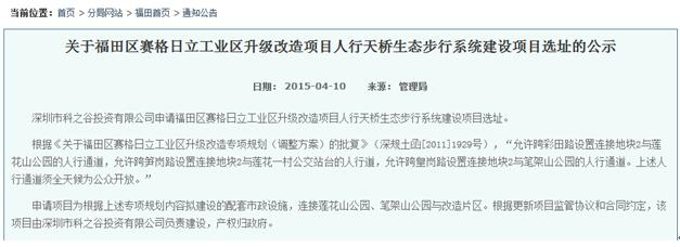 而據(jù)資料記載,市規(guī)土委曾經(jīng)在2015年4月10日,在福田管理局官網(wǎng)上發(fā)布了《關(guān)于福田區(qū)賽格日立工業(yè)區(qū)升級改造項(xiàng)目人行天橋生態(tài)步行系統(tǒng)建設(shè)項(xiàng)目選址的公示》,其中明確提到“根據(jù)《關(guān)于福田區(qū)賽格日立工業(yè)區(qū)升級改造專項(xiàng)規(guī)劃(調(diào)整方案)的批復(fù)》(深規(guī)土函[2011]1929號),‘允許跨彩田路設(shè)置連接地塊2與蓮花山公園的人行通道,允許跨筍崗路設(shè)置連接地塊2與蓮花一村公交站臺的人行道,允許跨皇崗路設(shè)置連接地塊2與筆架山公園的人行通道。上述人行通道須全天候?yàn)楣婇_放’。”
