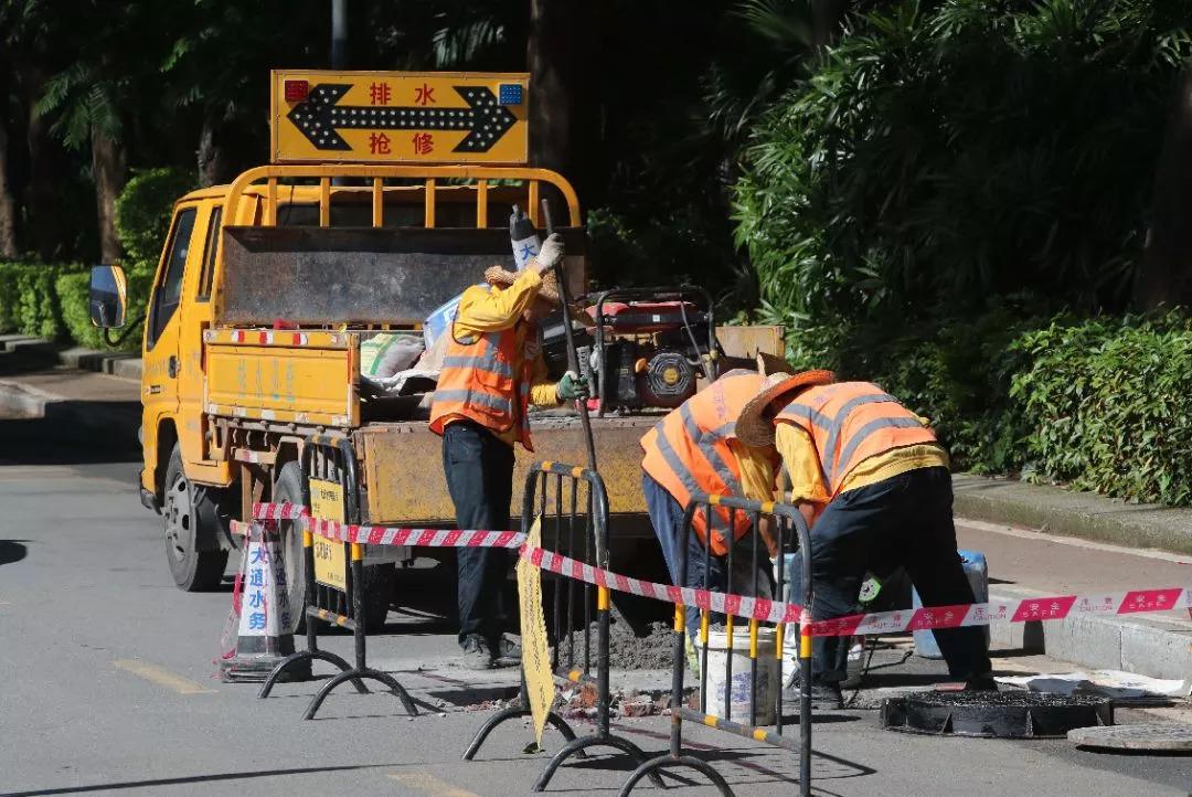 水務(wù)部門(mén)工作人員在瀾景路上對(duì)路面的破損井蓋進(jìn)行更換。