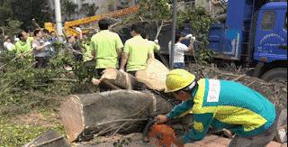 將鋸好的樹干和樹枝扛上貨車