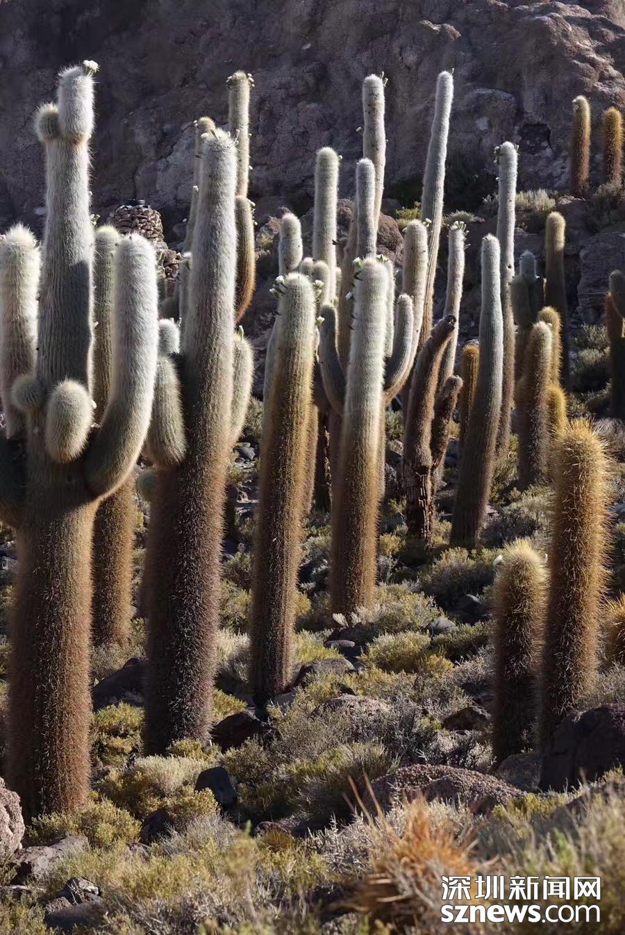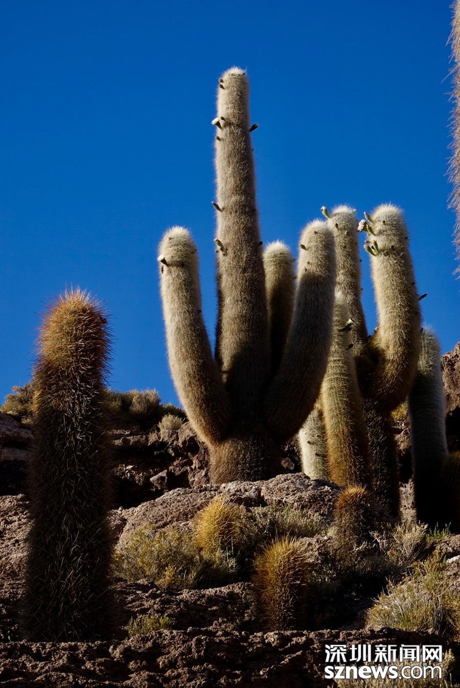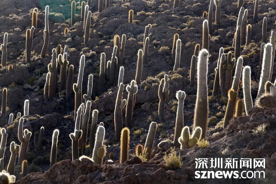深圳新聞網(wǎng)訊 烏尤尼鹽沼中,有一個孤立的小山頭,猶如瀚海中的小島。島上長滿巨大的仙人柱,據(jù)說有的已經(jīng)生長了上千年。這種形狀各異、耐鹽堿、耐干旱的熱帶植物豐富了鹽沼的風光,構(gòu)成絕無僅有的世界奇觀。 李仁奇 攝