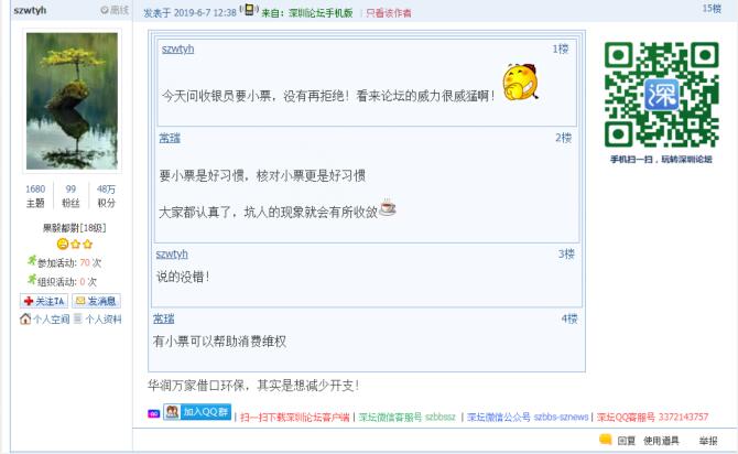 記者從問政平臺(tái)得知,5月底以來,還有市民發(fā)帖反映,除華潤萬家外,科技園萬象天地華潤Ole、僑香路沃爾瑪?shù)瘸幸泊嬖诓惶峁┘堎|(zhì)購物小票的情況。目前,市民仍然普遍認(rèn)同超市應(yīng)主動(dòng)提供紙質(zhì)購物小票,避免顧客被價(jià)格欺詐。有市民表示:“遇到最多的是優(yōu)惠打折,實(shí)際還是原價(jià)買單,這時(shí),手中有小票一目了然,不花冤枉錢。”還有市民質(zhì)疑,“奸商,動(dòng)不動(dòng)就打著環(huán)保這些高大上的理由作借口”。同時(shí),也有市民體驗(yàn)過微信小票后表示,“沃爾瑪手機(jī)掃碼付款是沒有紙票,購物小票藏在微信公眾號(hào)里,退換貨就在那里面進(jìn)行。這就是科技發(fā)達(dá)帶來的豐碩成果,挺好的。”截至記者發(fā)稿時(shí),市民關(guān)于科技園萬象天地華潤Ole、僑香路沃爾瑪?shù)瘸胁惶峁┵徫镄∑钡奶倪€沒有得到相關(guān)部門回應(yīng)。