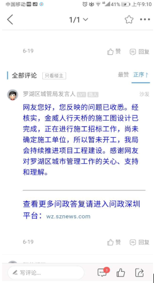 6月19日,羅湖區(qū)城管局表示“施工圖設(shè)計(jì)已完成,正在進(jìn)行施工招標(biāo)工作”。7月24日,該市民回帖詢問招標(biāo)是否已有結(jié)果,表示“依然沒見工程隊(duì)施工”。