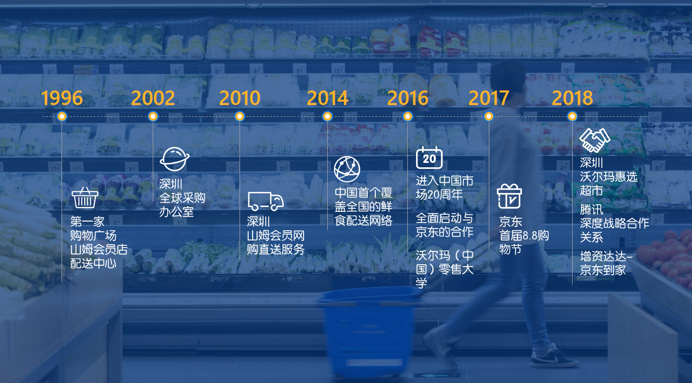沃爾瑪于1996年在深圳開(kāi)設(shè)中國(guó)第一家沃爾瑪購(gòu)物廣場(chǎng)和山姆會(huì)員商店。進(jìn)駐中國(guó)20余年,擁有員工約10萬(wàn)。沃爾瑪目前已經(jīng)在全國(guó)180多個(gè)城市開(kāi)設(shè)了400多家商場(chǎng)、9家干倉(cāng)配送中心和11家鮮食配送中心。沃爾瑪中國(guó)與超過(guò)7,000家供應(yīng)商建立了合作關(guān)系。