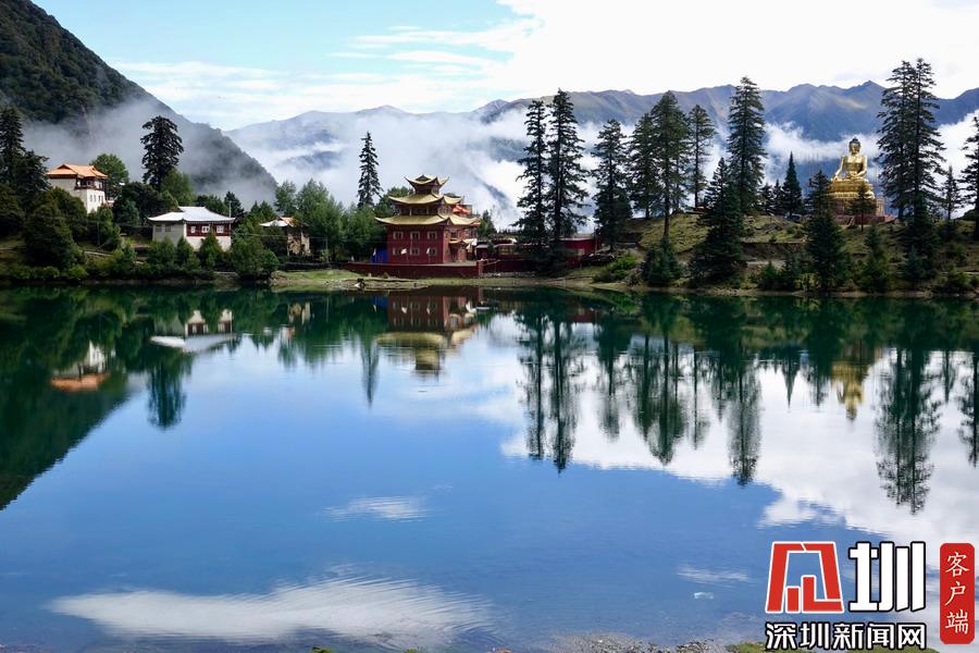 湖的四周是森林和由措卡寺寺僧主持修建的藏傳佛教各色建筑,它們時(shí)而云遮霧障,時(shí)而與藍(lán)天白云一起倒映在湖中。李仁奇攝