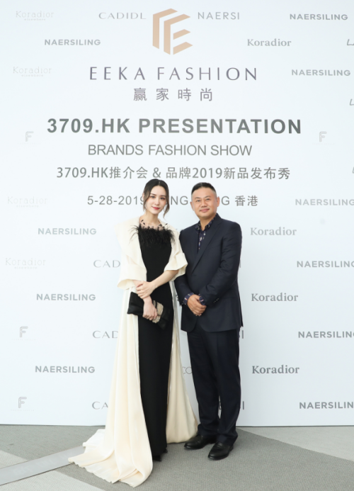 現(xiàn)任贏家時(shí)尚控股有限公司董事局主席金明先生和米蘭達(dá)可兒在2017年米蘭時(shí)裝周Koradior發(fā)布秀背景板合影