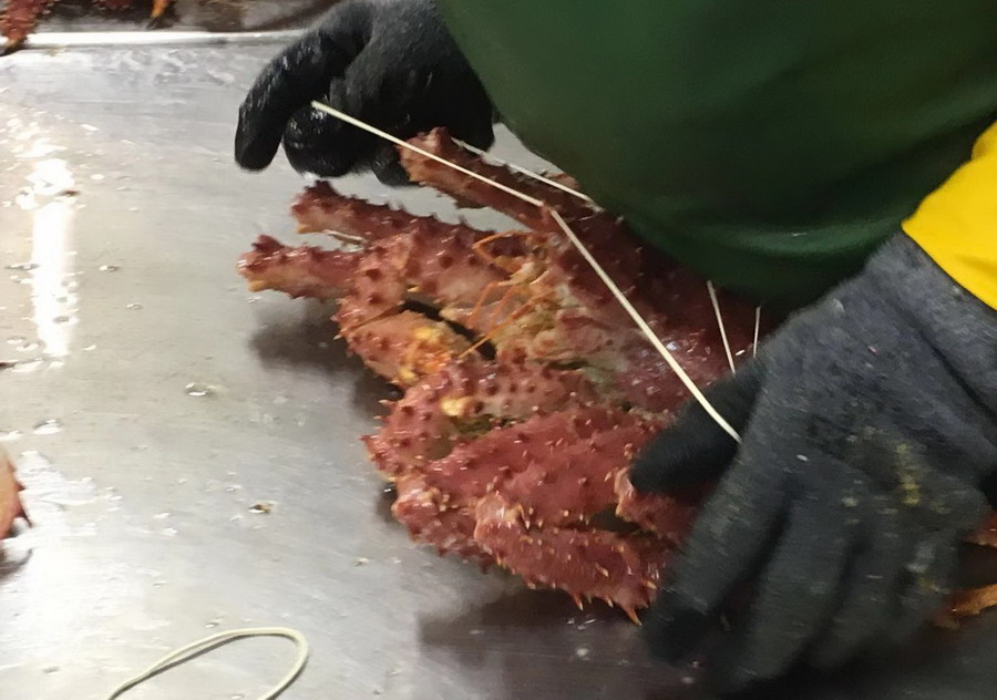 據(jù)介紹,蜘蛛蟹是用一種鐵籠子放入深海誘捕的,智利政府規(guī)定,小于1.5公斤的不許捕撈,因此,鐵籠的孔隙會(huì)放走幼小的蜘蛛蟹。李仁奇攝