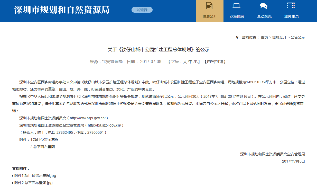 早在2017年,當時的市規(guī)土委曾經(jīng)在官方網(wǎng)站發(fā)布了《關于<鐵仔山城市公園擴建工程總體規(guī)劃>的公示》:深圳市寶安區(qū)西鄉(xiāng)街道辦事處來文申請《鐵仔山城市公園擴建工程總體規(guī)劃》審批。鐵仔山城市公園擴建工程位于寶安區(qū)西鄉(xiāng)街道,用地規(guī)模為1436510.19平方米,公園定位:通過城市綠芯、活力林岸的重塑,使山、城、海一線,打造融合生態(tài)、文化、產(chǎn)業(yè)的中央公園。