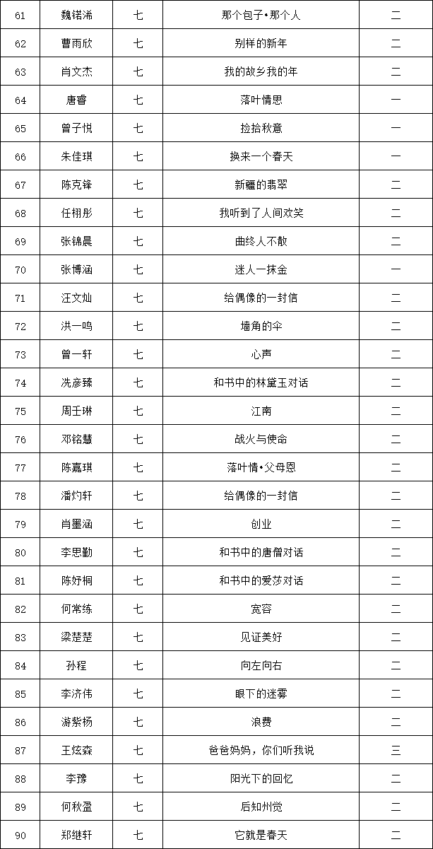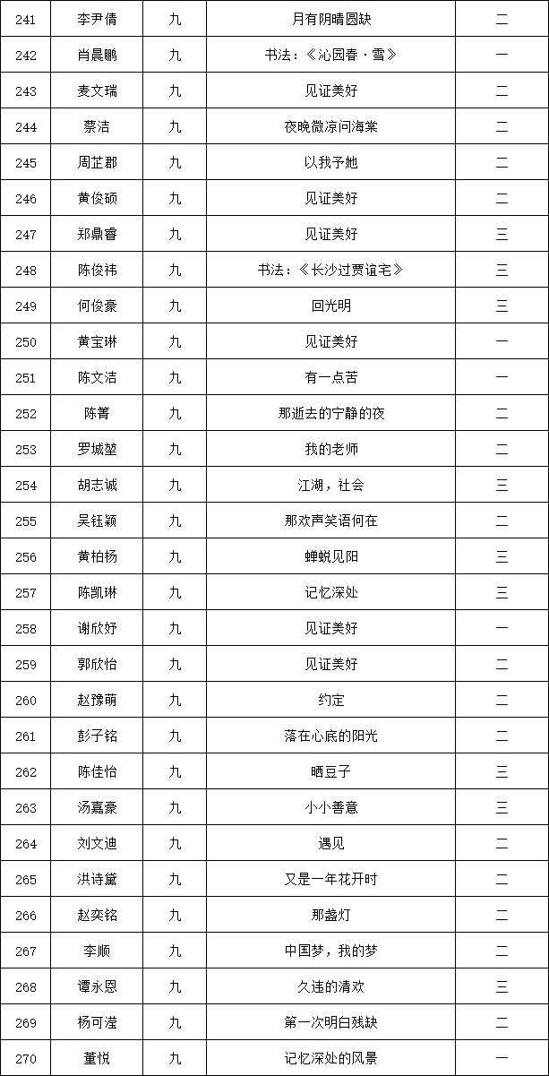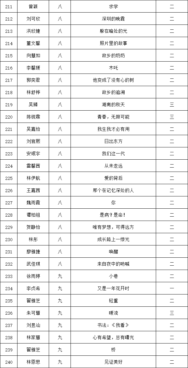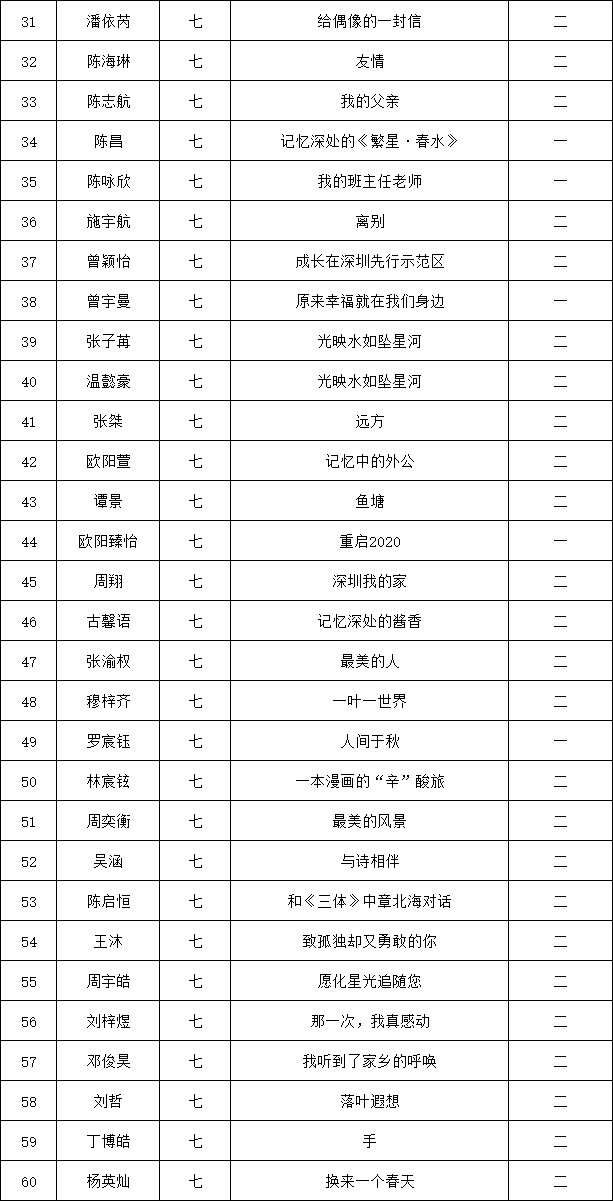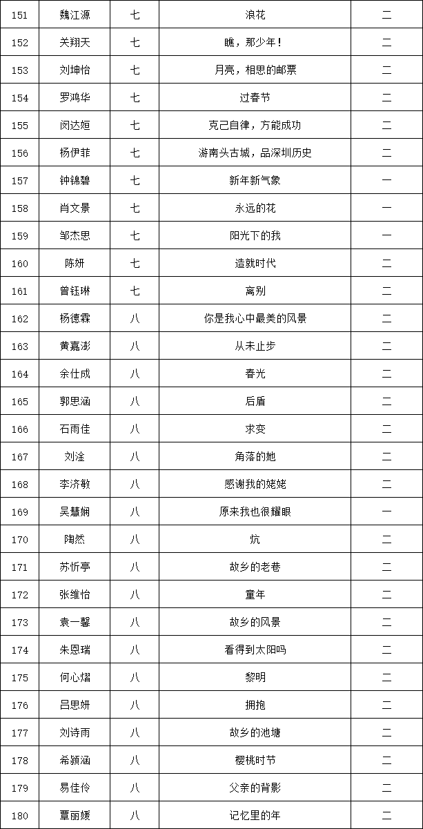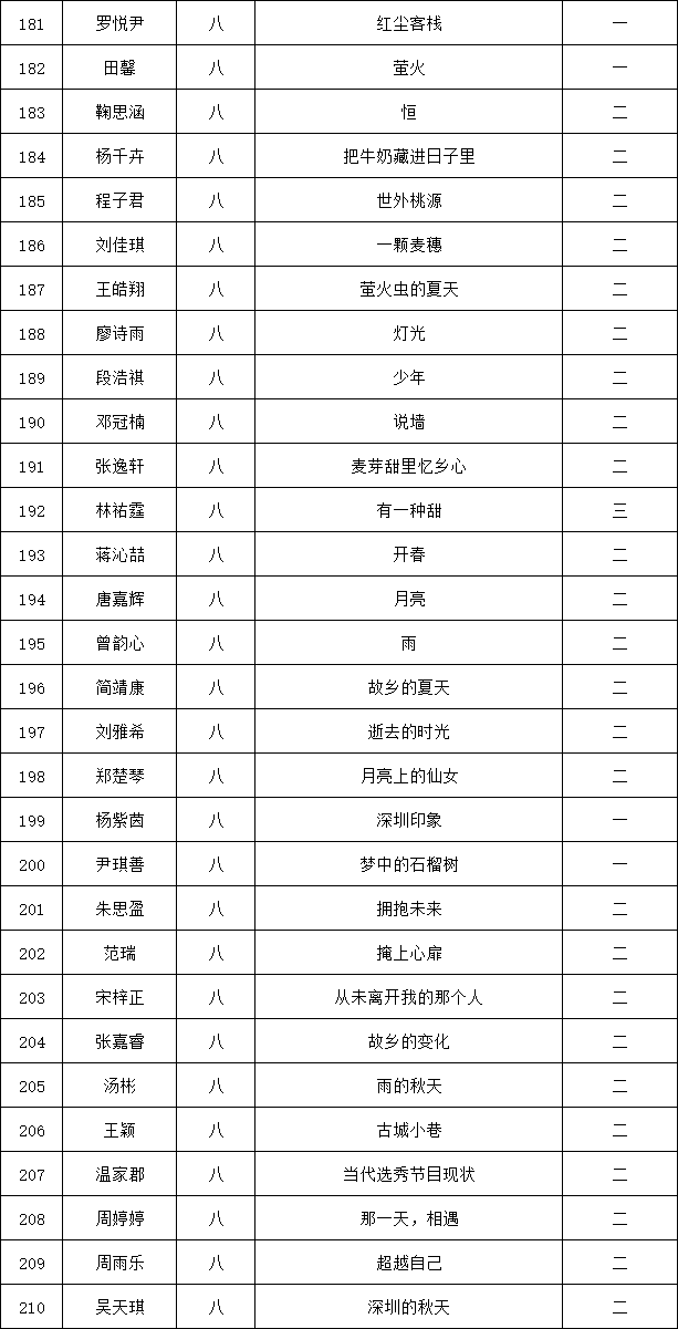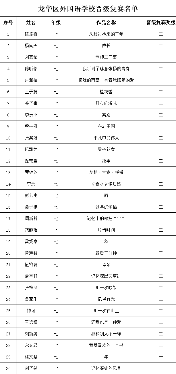 自2021年1月,活動征稿啟動以來,獲得了深圳市廣大中小學生、教師、文學愛好者的熱烈響應積極參與,吸引了深圳百余所學校的上萬人關注報名?,F公布龍華區(qū)外國語學校專場晉級復賽名單如下:
