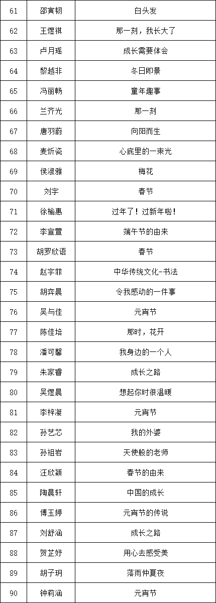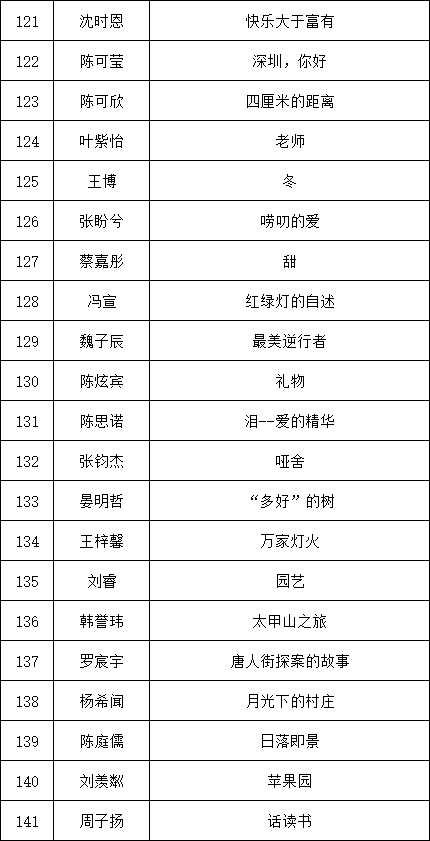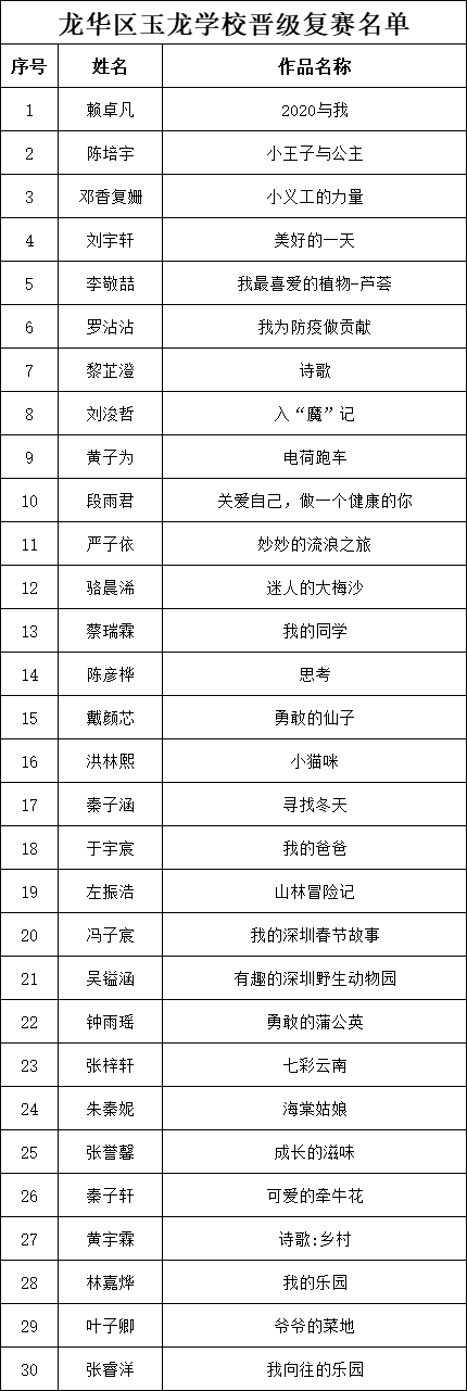 自2021年1月,活動征稿啟動以來,獲得了深圳市廣大中小學生、教師、文學愛好者的熱烈響應積極參與,吸引了深圳百余所學校的上萬人關注報名。現(xiàn)公布龍華區(qū)玉龍學校專場晉級復賽名單如下: