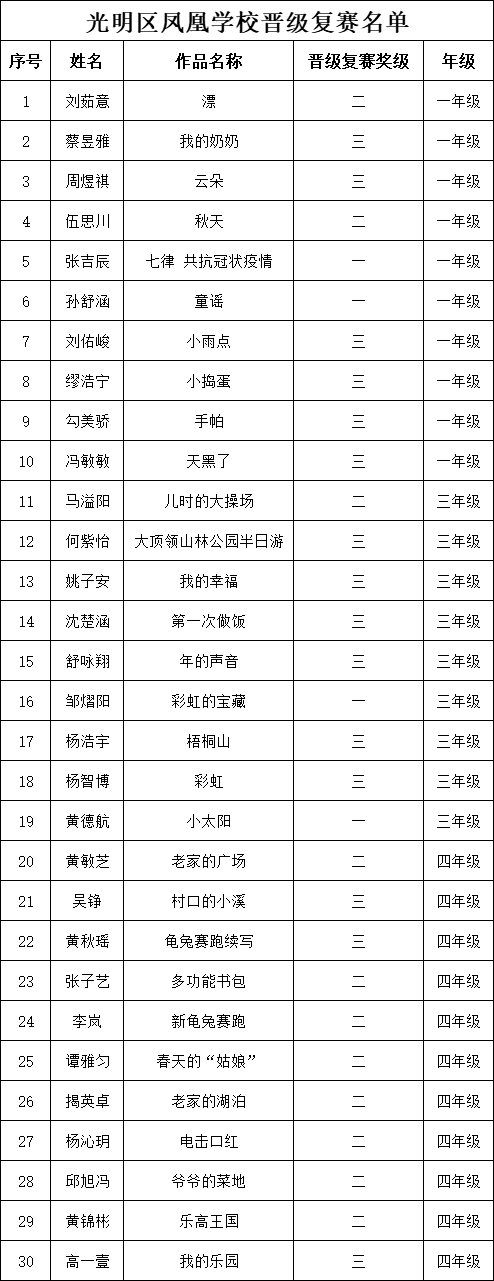 自2021年1月,活動征稿啟動以來,獲得了深圳市廣大中小學(xué)生、教師、文學(xué)愛好者的熱烈響應(yīng)積極參與,吸引了深圳百余所學(xué)校的上萬人關(guān)注報名?,F(xiàn)公布深圳市光明區(qū)鳳凰學(xué)校專場晉級復(fù)賽名單如下:
