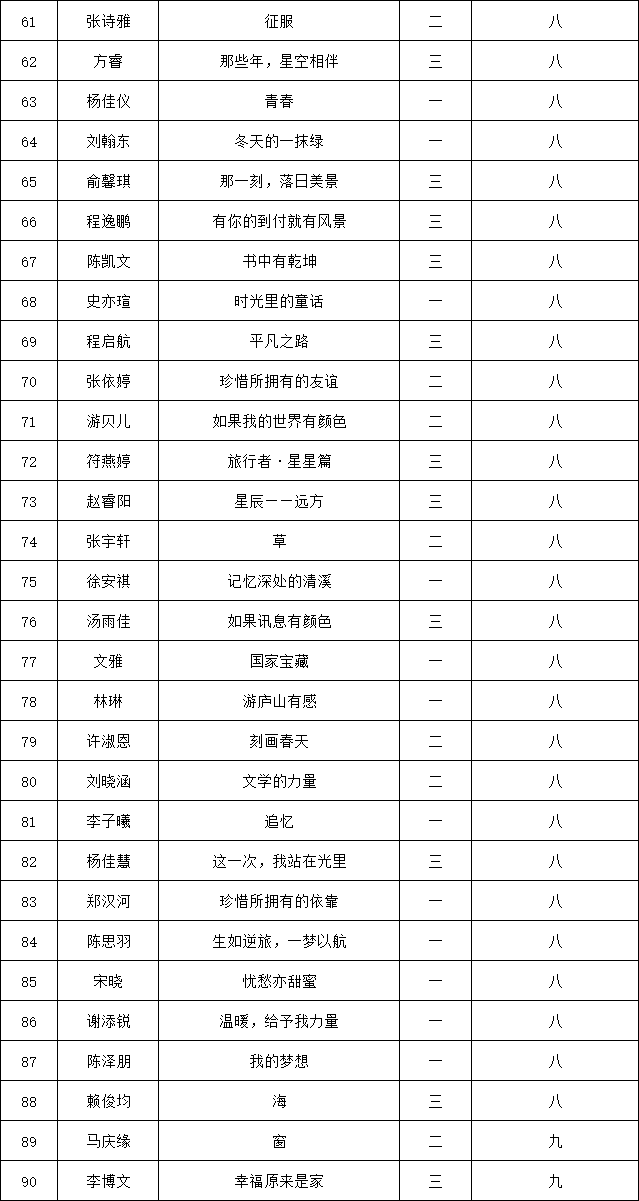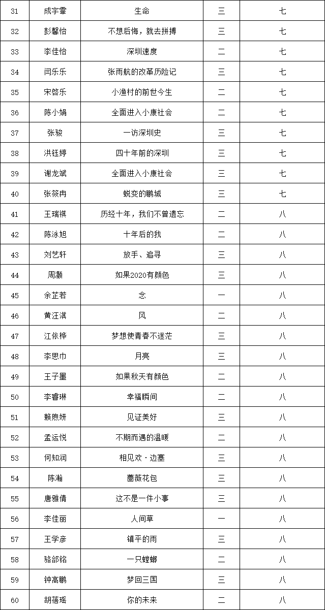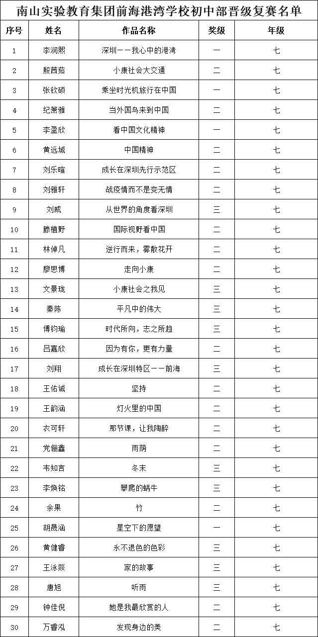 自2021年1月,活動征稿啟動以來,獲得了深圳市廣大中小學(xué)生、教師、文學(xué)愛好者的熱烈響應(yīng)積極參與,吸引了深圳百余所學(xué)校的上萬人關(guān)注報(bào)名?,F(xiàn)公布南山實(shí)驗(yàn)教育集團(tuán)前海港灣學(xué)校(初中部)專場晉級復(fù)賽名單如下: