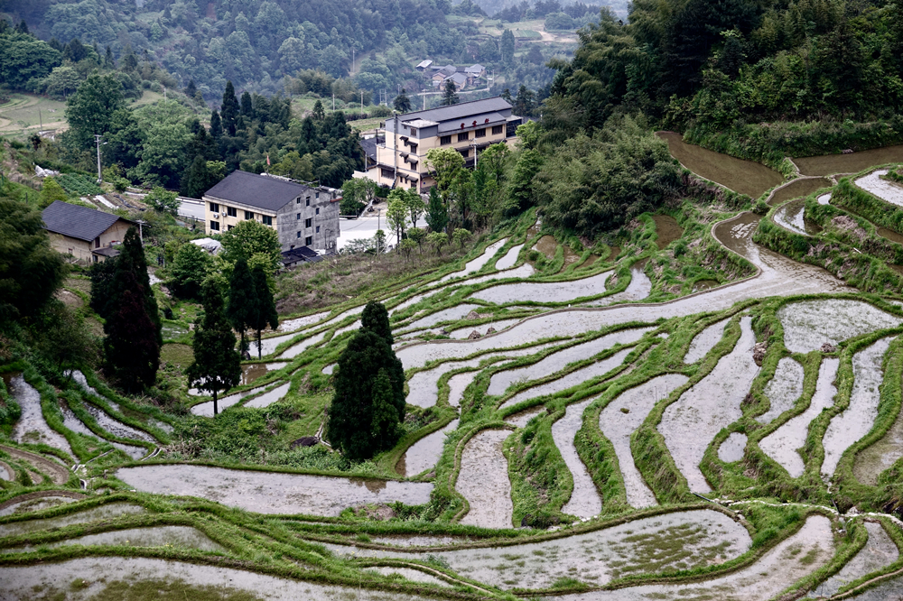 或?qū)捇蛘奶萏铮婚L(zhǎng)條一小塊,不規(guī)則地依山勢(shì)上下伸展。李仁奇 攝