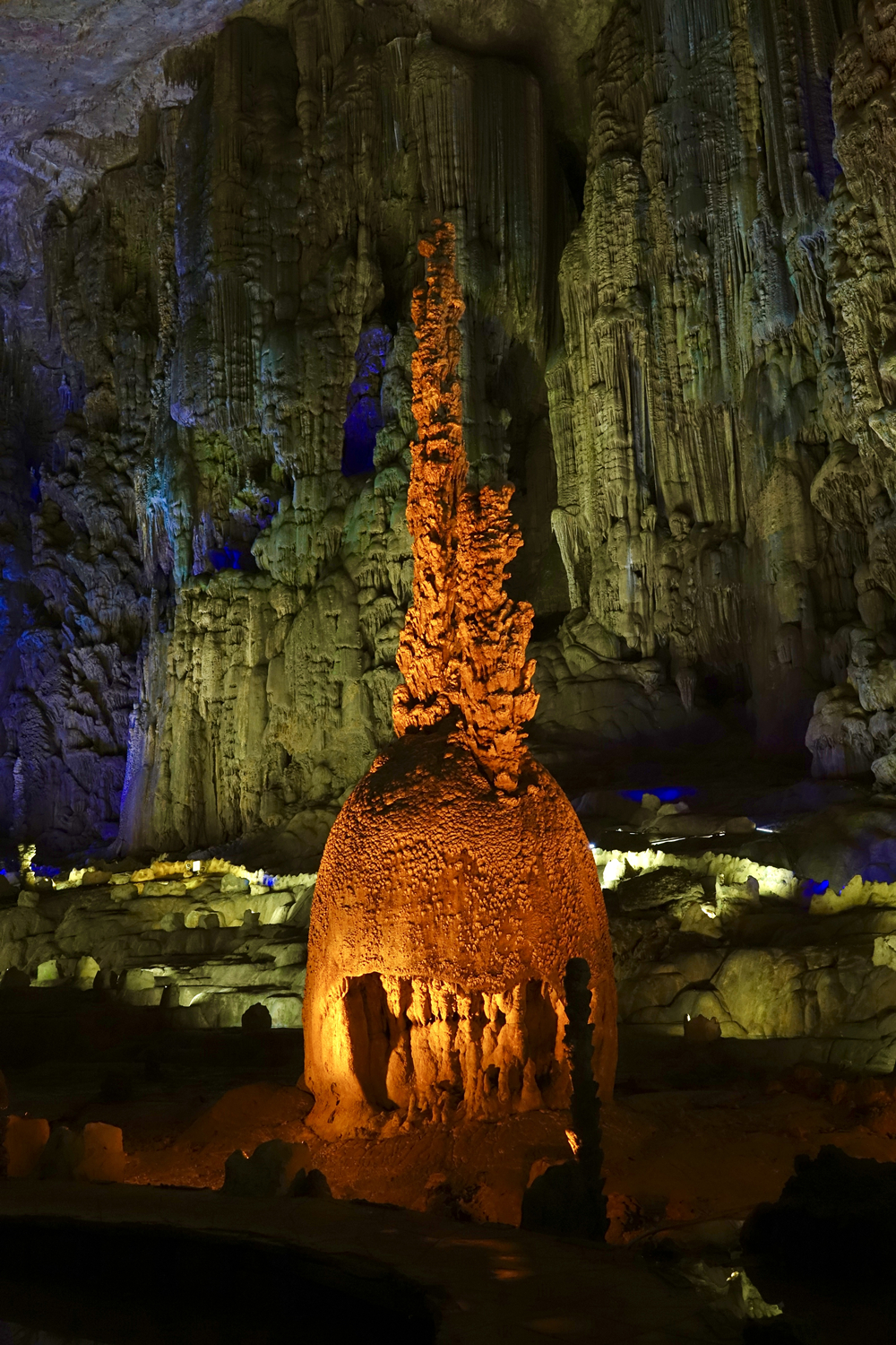“霸王盔”,在一直徑3米多的圓形堆積物上又長出兩支并靠的戟形石筍,很像西楚霸王項羽所佩戴的頭盔。李仁奇 攝