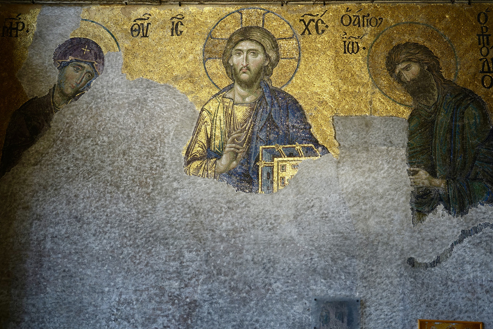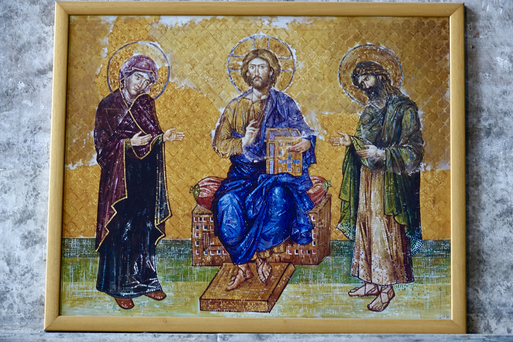 馬賽克《三圣像》,畫面下方已經(jīng)被嚴重損毀,但仍然能看到中央的耶穌基督,其兩側(cè)是圣母瑪利亞和施洗者約翰。李仁奇 攝