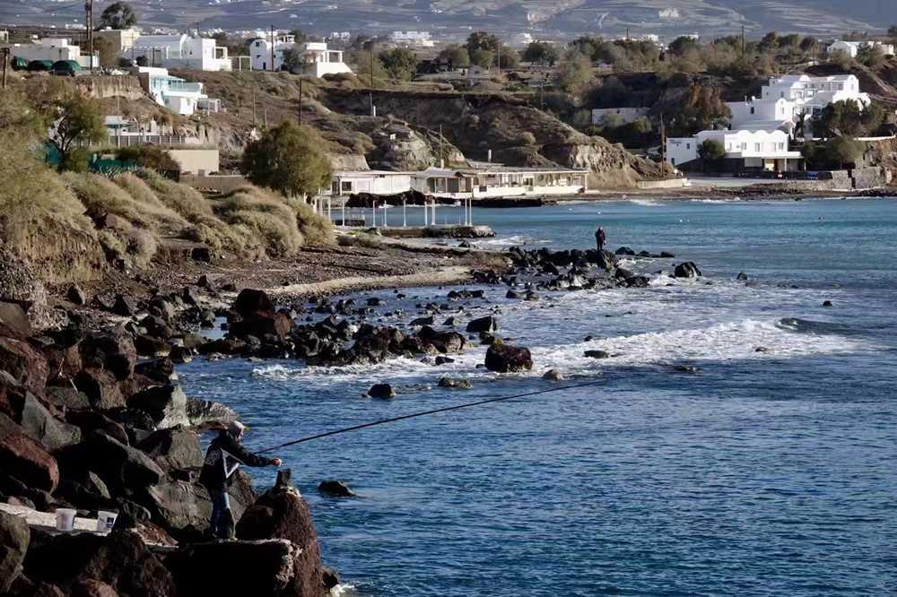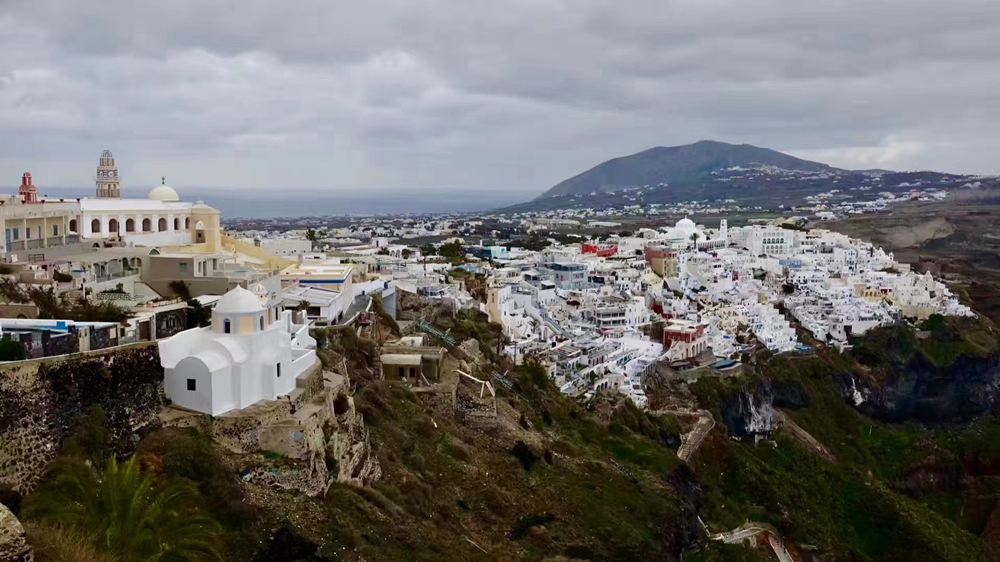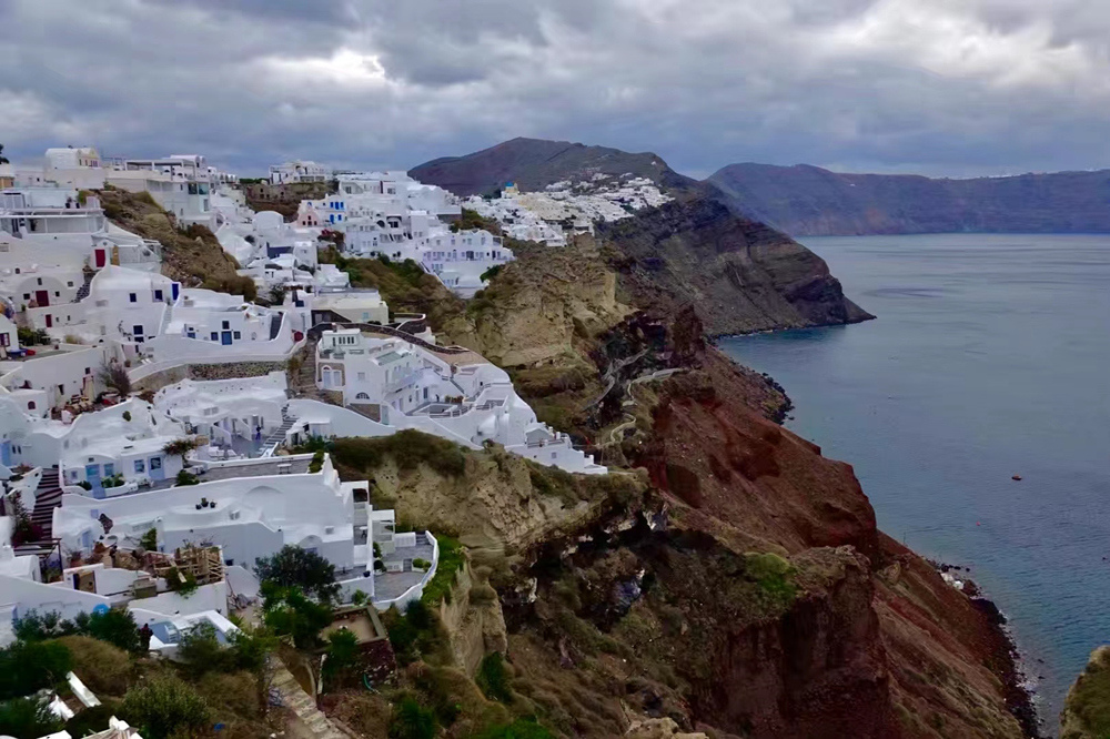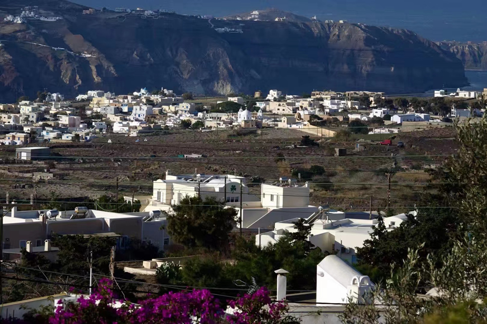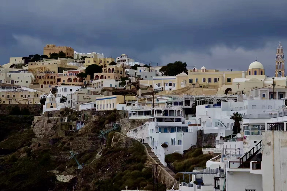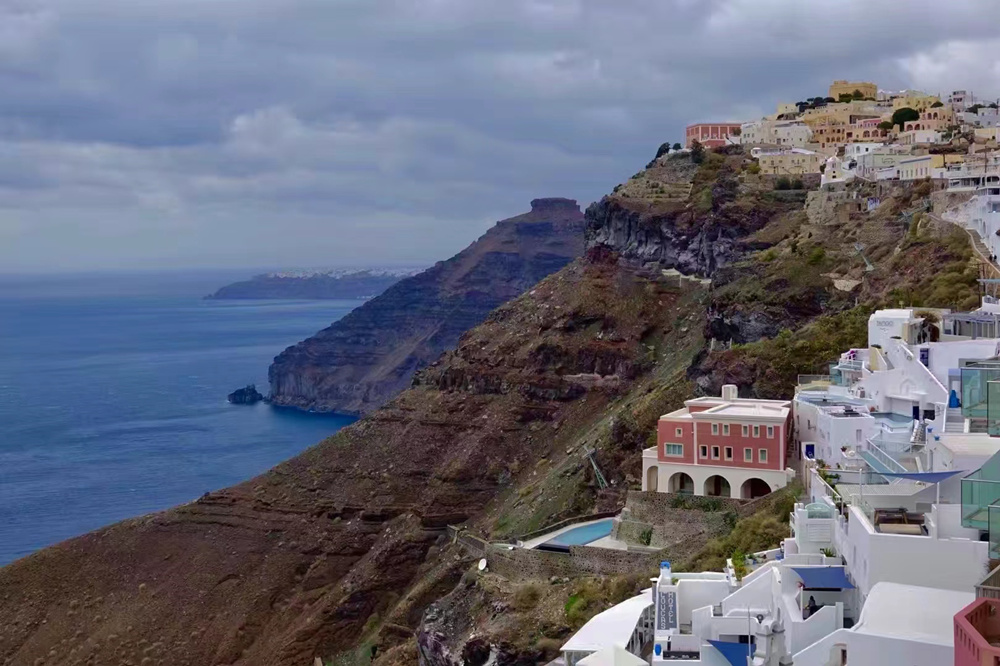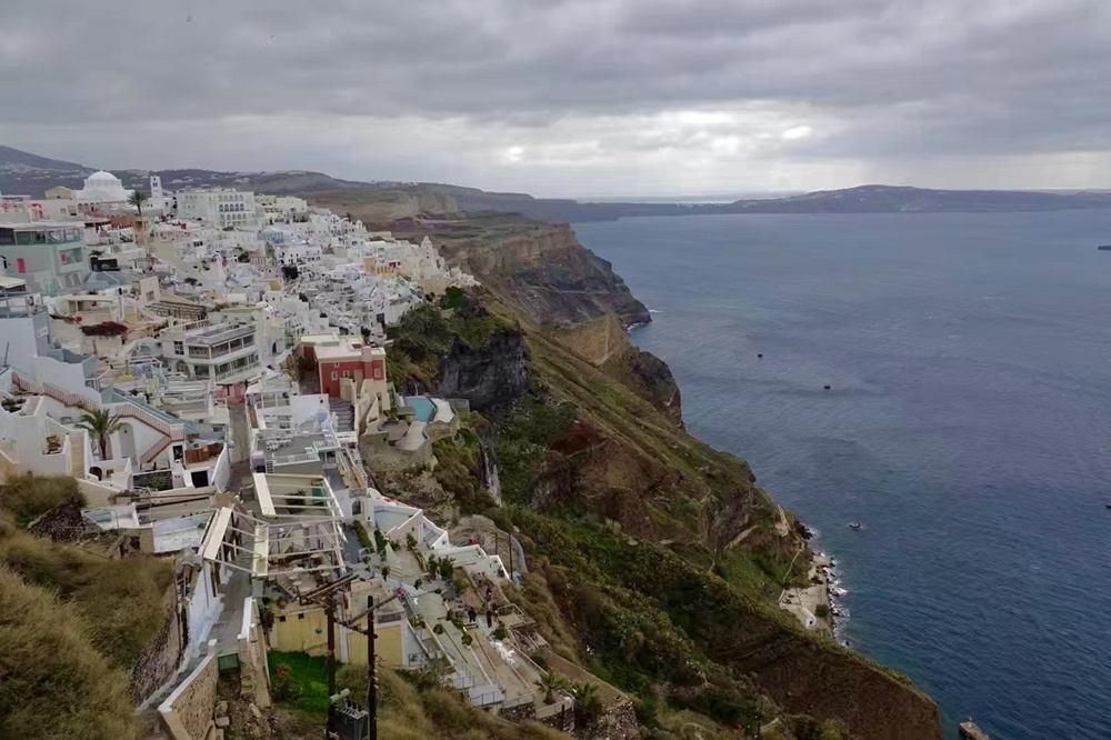 費(fèi)拉碼頭附近有許多懸崖,無數(shù)的白色小屋依山而建,與天空、海洋混成一體,這是地中海獨(dú)有的景觀。李仁奇 攝