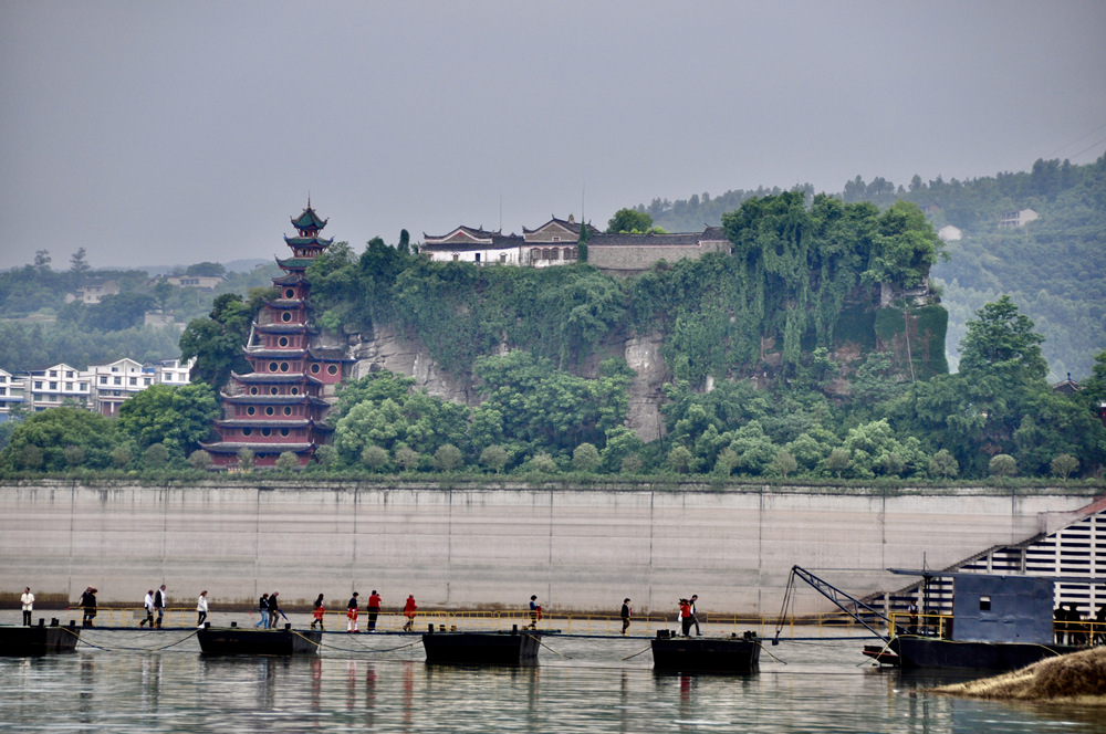 三峽庫區(qū)蓄水后,石寶寨被一道水泥圍堰保護起來,成為孤島,與江岸的聯(lián)系全憑一座吊橋,又被比喻為“世界最大的盆景”、“永不沉沒的航空母艦”。李仁奇 攝