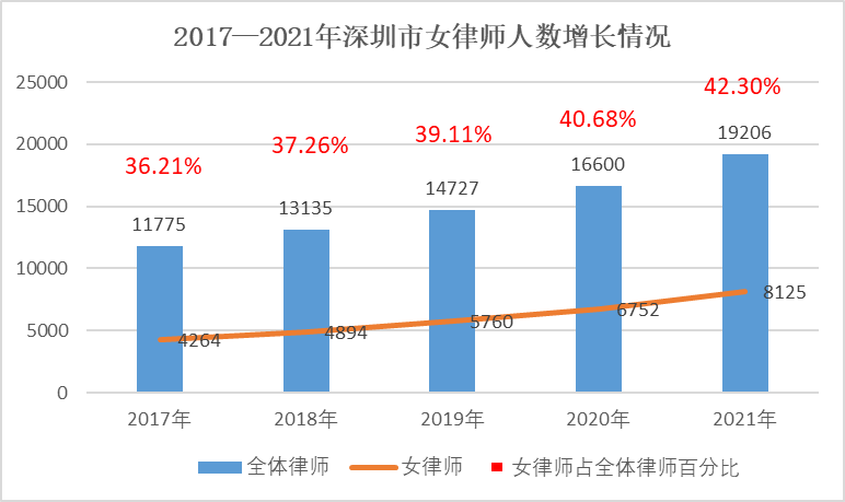 一、深圳女律師隊(duì)伍2017—2021年增長(zhǎng)分析:深圳女律師占比超42%