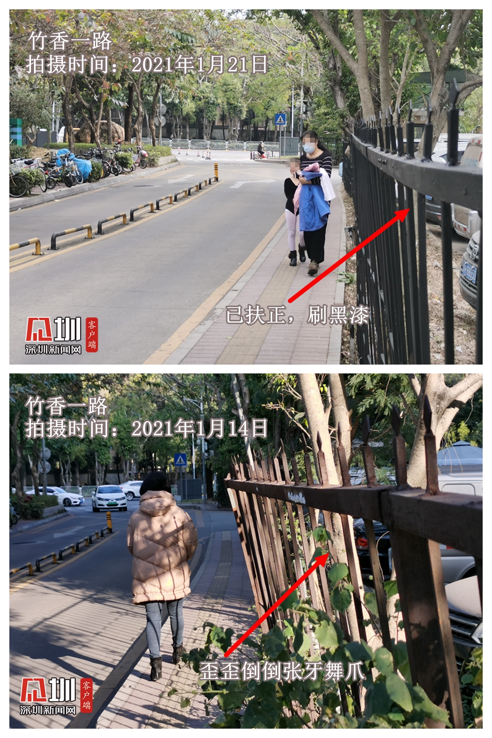 記者在竹香一路看到,原本向外傾斜的圍欄已經(jīng)全部扶正加固,且重新噴上黑色新漆,看起來(lái)整齊了許多,通行體驗(yàn)較之前更好?!艾F(xiàn)在弄得不錯(cuò),比之前牢固很多,向外的尖尖也都弄整齊了”家住附近的王先生說(shuō)。