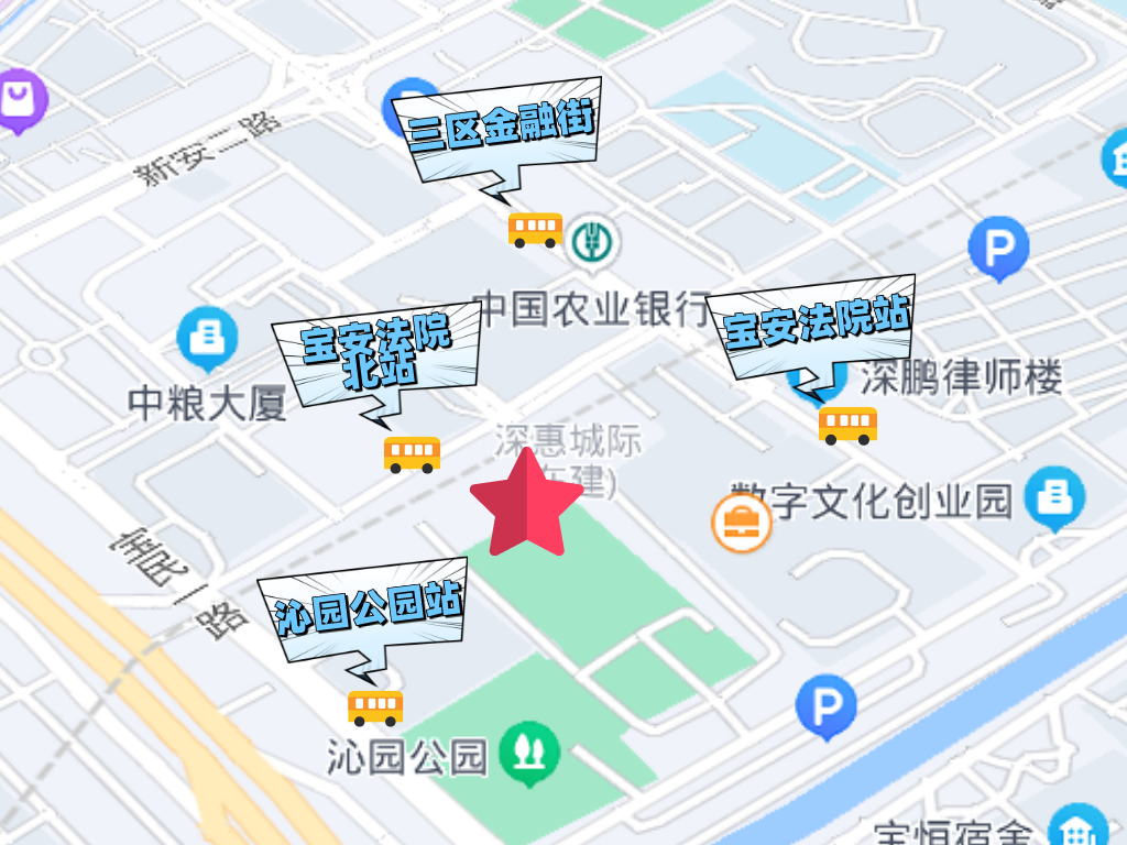 周邊公共交通站點(僅供參考):寶安法院北站(公交B832路、B904路、M210路),三區(qū)金融街站(公交603路、605路、B832路、M210路),沁園公園站(公交603路、605路、B904路、M210路、395路),寶安法院站(公交395路、603路、605路、B904路、M210路)