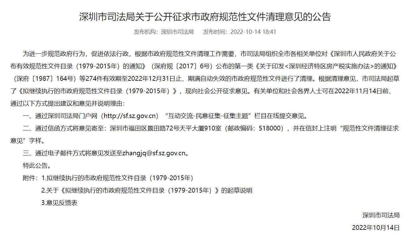 讀特客戶(hù)端·深圳新聞網(wǎng)2022年10月20日訊(記者 翁任瑩)近日,深圳市司法局就《擬繼續(xù)執(zhí)行的市政府規(guī)范性文件目錄(1979-2015年)》向社會(huì)公開(kāi)征求意見(jiàn),擬對(duì)274件有效期至2022年12月31日止、期滿(mǎn)自動(dòng)失效的市政府規(guī)范性文件進(jìn)行清理。