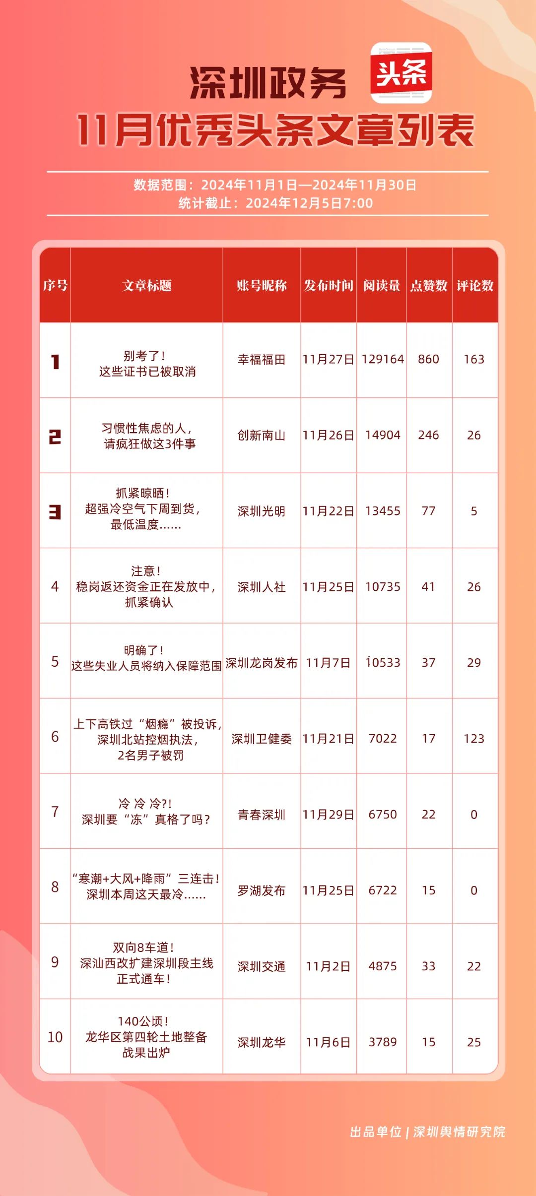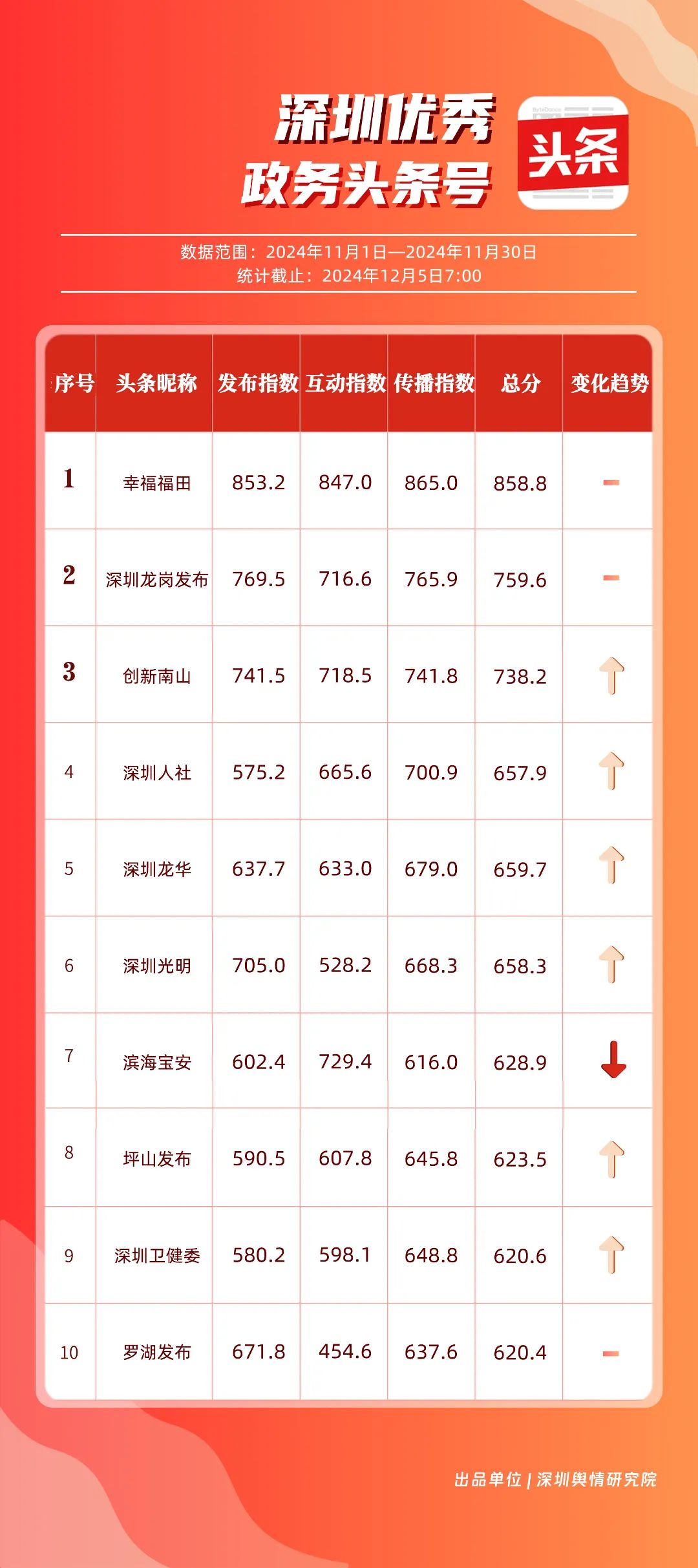 11月,“幸福福田”“深圳龍崗發(fā)布”“創(chuàng)新南山”“深圳人社”“深圳龍華”“深圳光明”“濱海寶安”“坪山發(fā)布”“深圳衛(wèi)健委”“羅湖發(fā)布”共10個(gè)政務(wù)頭條號(hào)入選“優(yōu)秀政務(wù)頭條號(hào)”榜單?!靶腋8L铩卑l(fā)布大量民生相關(guān)信息,穩(wěn)居第一。“深圳龍崗發(fā)布”同樣表現(xiàn)不凡,排名始終位于前列,展現(xiàn)了其在信息傳播與政務(wù)服務(wù)方面的卓越能力。此外,賬號(hào)“創(chuàng)新南山”“深圳人社”“深圳龍華”“深圳光明”在榜單中的排名有所提升,為政務(wù)新媒體樹(shù)立了典范。