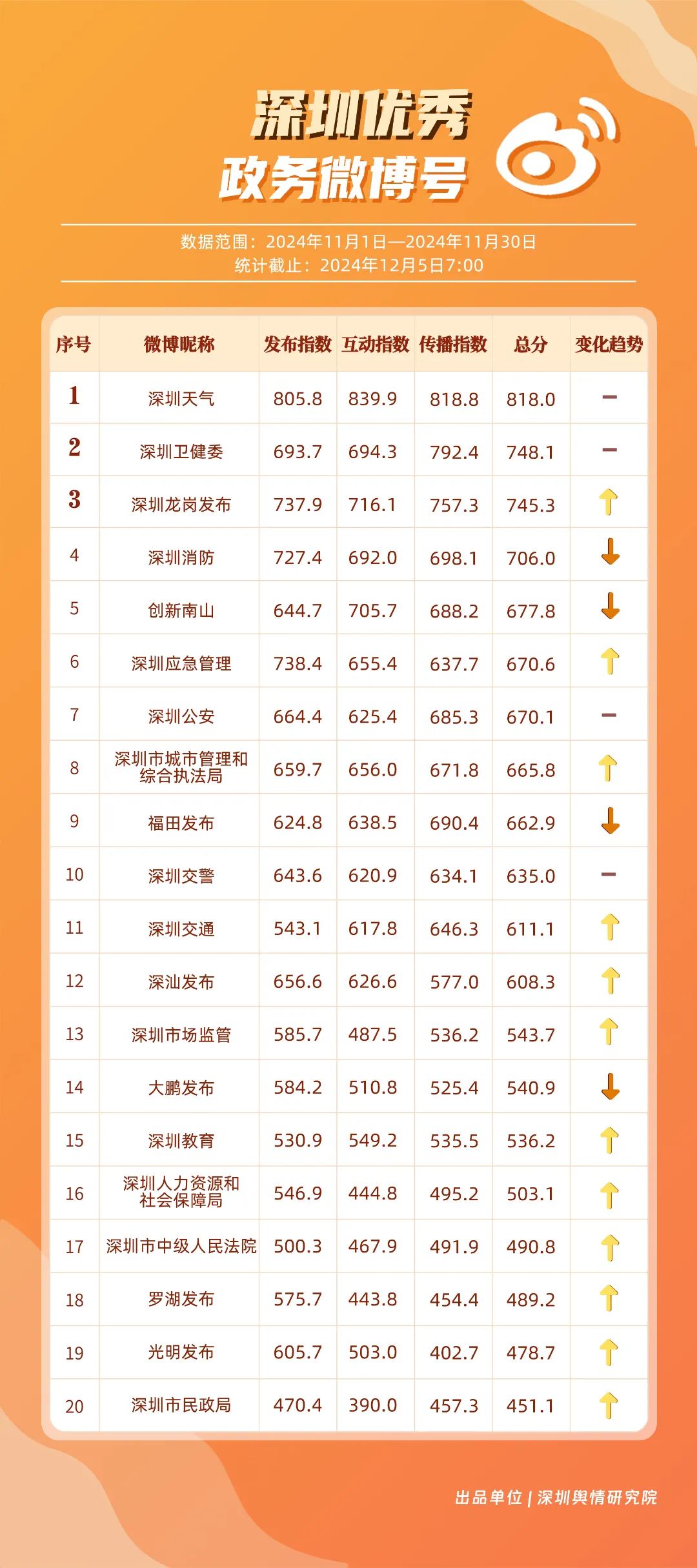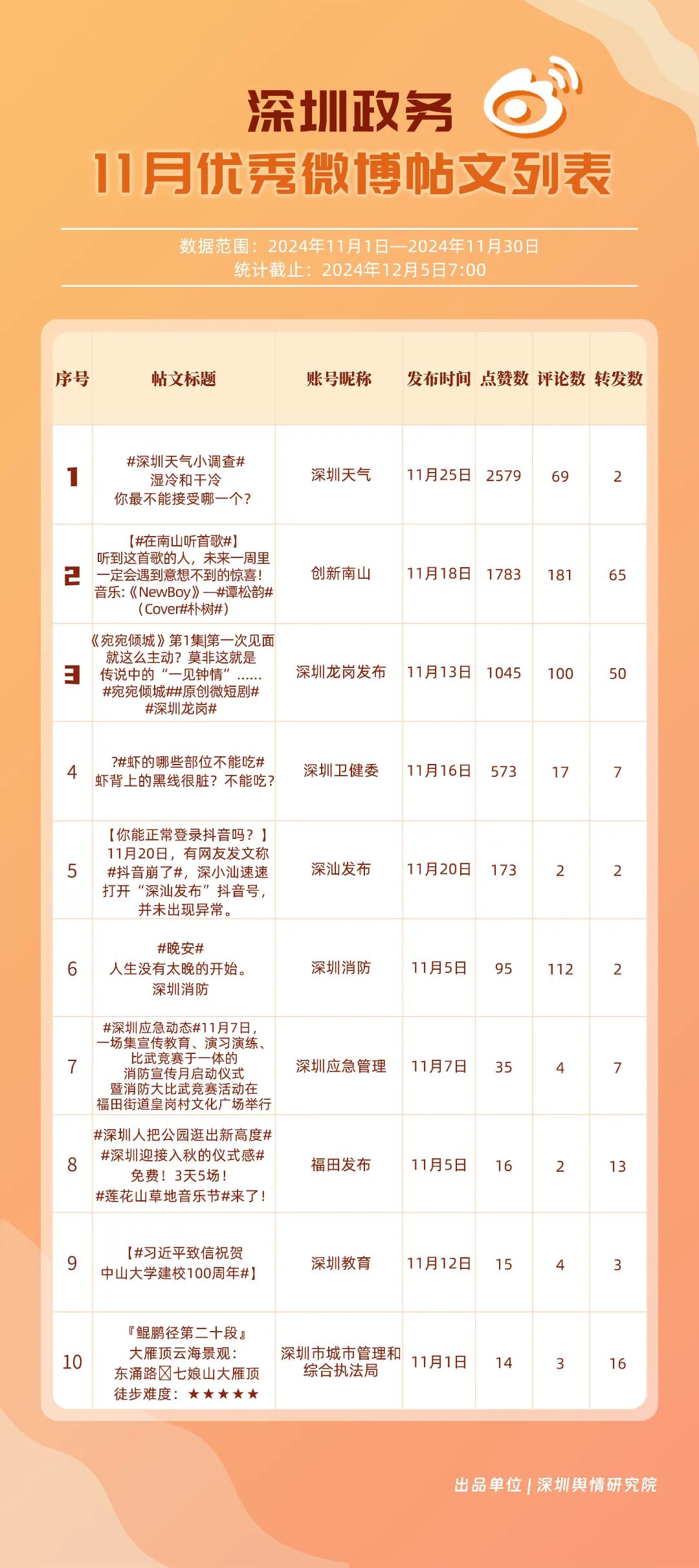 11月,“深圳天氣”“深圳衛(wèi)健委”“深圳龍崗發(fā)布”“深圳消防”“創(chuàng)新南山”“深圳應(yīng)急管理”“深圳公安”“深圳市城市管理和綜合執(zhí)法局”“福田發(fā)布”“深圳交警”等20個(gè)賬號(hào)入選“優(yōu)秀政務(wù)微博號(hào)”?!吧钲谔鞖狻薄吧钲谛l(wèi)健委”賬號(hào)在信息傳播上不斷精進(jìn),為市民帶來(lái)及時(shí)、優(yōu)質(zhì)且高效的資訊,內(nèi)容緊貼民生,贏得了市民的廣泛贊譽(yù),排名穩(wěn)定在前2名。同時(shí),“深圳龍崗發(fā)布”“深圳消防”和“創(chuàng)新南山”等賬號(hào)也能夠精準(zhǔn)滿足市民的信息需求,并在此基礎(chǔ)上提升市民閱讀體驗(yàn),推動(dòng)了其在榜單上的穩(wěn)步提升,彰顯了政務(wù)微博的創(chuàng)新活力與社會(huì)價(jià)值。