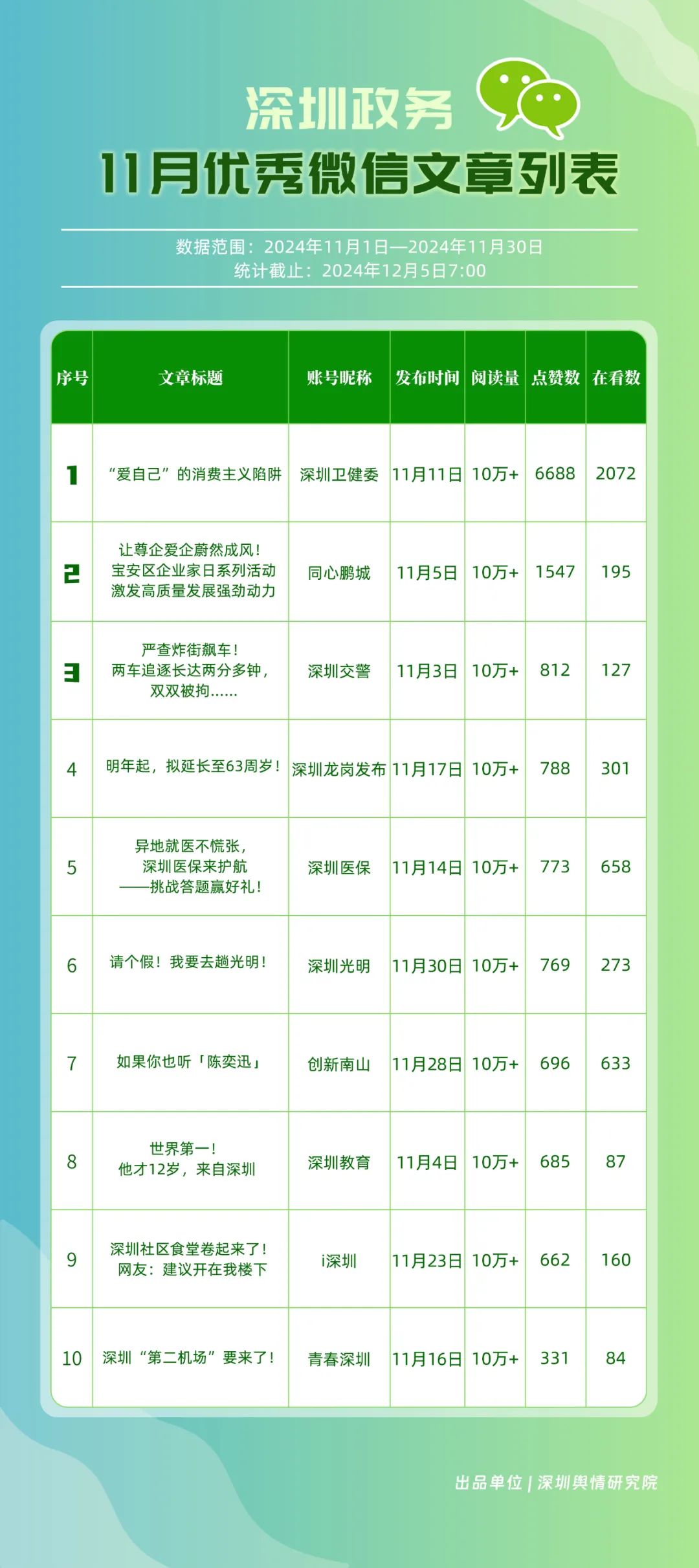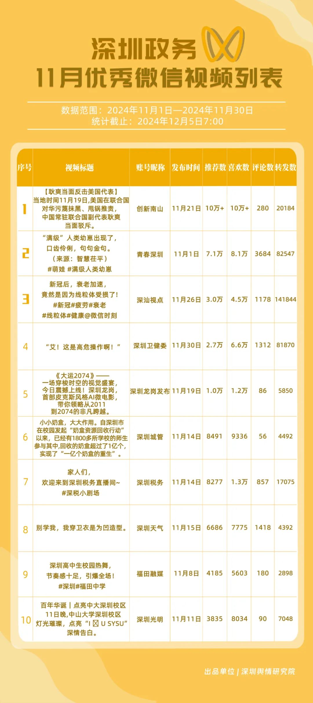 11月,獲“深圳優(yōu)秀政務(wù)微信視頻號(hào)”稱號(hào)的分別是“深汕視點(diǎn)”“青春深圳”“深圳衛(wèi)健委”“創(chuàng)新南山”“深圳龍崗發(fā)布”“福田融媒”“深圳教育”“深圳天氣”“深圳稅務(wù)”“深圳光明”。其中,“深汕視點(diǎn)”與“青春深圳”通過(guò)積極轉(zhuǎn)發(fā)涵蓋廣泛領(lǐng)域的優(yōu)質(zhì)視頻內(nèi)容,贏得了網(wǎng)民的廣泛點(diǎn)贊與推薦,彰顯了其在內(nèi)容聚合與傳播上的獨(dú)到之處。“深圳衛(wèi)健委”則專注于衛(wèi)生健康領(lǐng)域,發(fā)布了一系列高質(zhì)量的內(nèi)容,深受網(wǎng)民喜愛(ài),進(jìn)一步鞏固了其在健康傳播領(lǐng)域的領(lǐng)先地位。