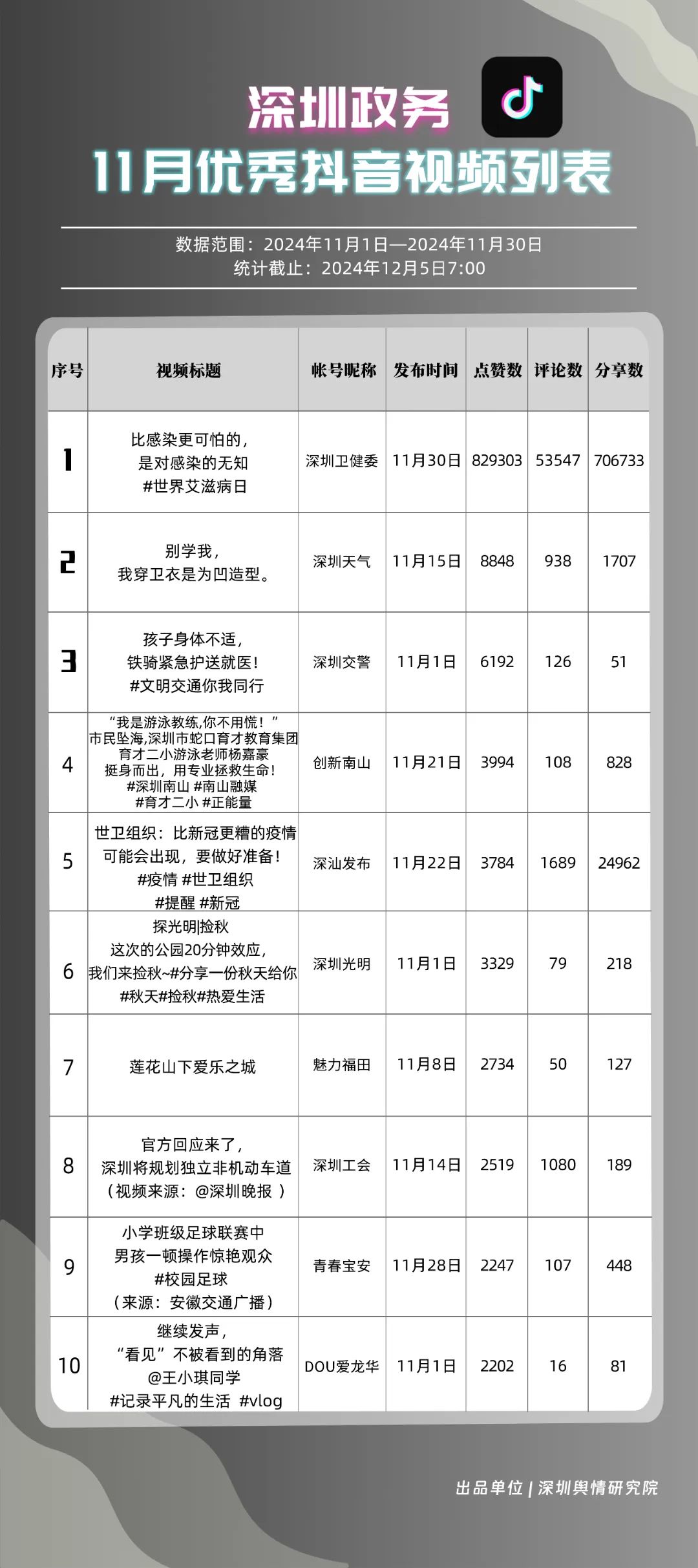 11月,“深圳衛(wèi)健委”“掌上龍崗”“深圳天氣”“深汕發(fā)布”“深圳工會(huì)”“深圳交警”“創(chuàng)新南山”“DOU愛(ài)龍華”“深圳光明”“中國(guó)前?!惫?0個(gè)政務(wù)抖音號(hào)獲得“深圳優(yōu)秀政務(wù)抖音號(hào)”稱號(hào)?!吧钲谛l(wèi)健委”憑借高質(zhì)量劇情內(nèi)容,巧妙融入健康知識(shí),視頻累計(jì)收獲近百萬(wàn)點(diǎn)贊。同時(shí),“掌上龍崗”和“深圳天氣”也在視頻內(nèi)容創(chuàng)新上不斷探索,通過(guò)優(yōu)化宣傳策略和信息傳播方式,使得網(wǎng)民能夠在輕松愉快的氛圍中了解龍崗區(qū)的最新動(dòng)態(tài)和深圳的天氣信息,展現(xiàn)了政務(wù)抖音號(hào)的獨(dú)特魅力與社會(huì)影響力。