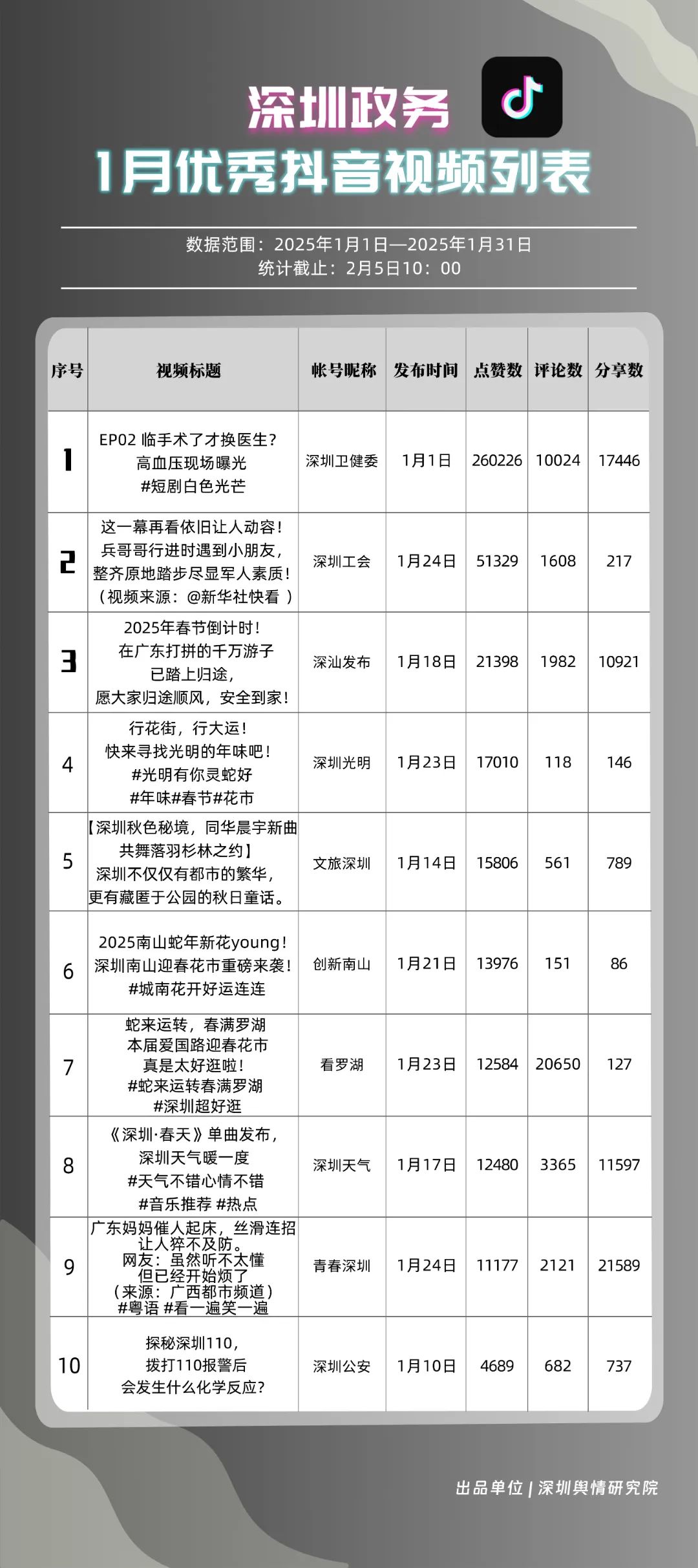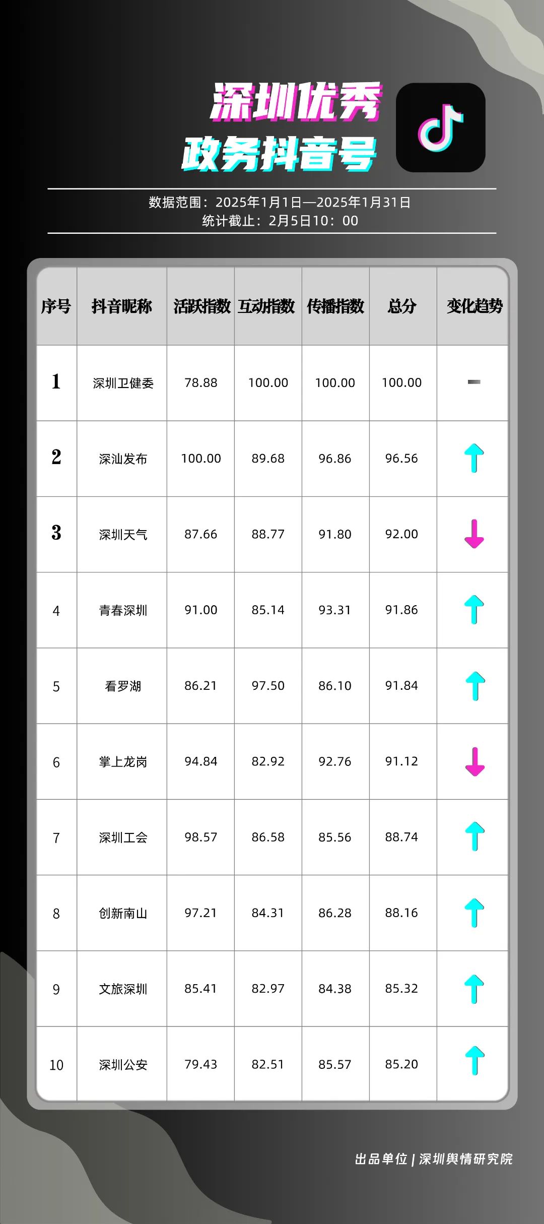 1月,“深圳衛(wèi)健委”“深汕發(fā)布”“深圳天氣”“青春深圳”“看羅湖”“掌上龍崗”“深圳工會”“創(chuàng)新南山”“文旅深圳”“深圳公安”共10個政務(wù)抖音號獲得“深圳優(yōu)秀政務(wù)抖音號”稱號?!吧钲谛l(wèi)健委”“深汕發(fā)布”“深圳天氣”成績優(yōu)異,綜合實力較強,位于榜單前列?!扒啻荷钲凇薄翱戳_湖”等賬號排名有所提升,彰顯了這些賬號在拓寬受眾基礎(chǔ)、增強用戶黏性等方面所取得的積極成效。